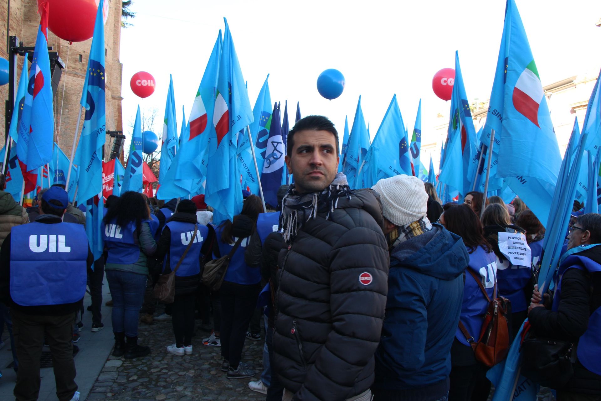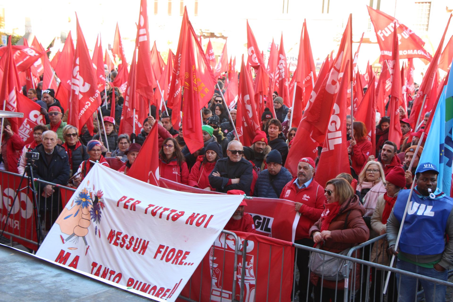 Tante le bandiere rosse e azzurre delle due sigle sindacali davanti al Municipio, dove sono intervenuti, fra gli altri, Massimo Bussandri, segretario generale Cgil Emilia-Romagna ed Emanuele Ronzoni, segretario organizzativo Uil nazionale. Gli organizzatori, in una nota inviata alla stampa, parlano di “oltre 8.000 lavoratrici, lavoratori, pensionate e pensionati sopraggiunti dai territori di Ravenna, Forlì, Cesena e Rimini”.