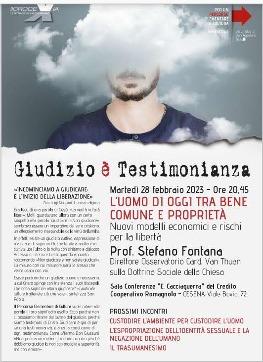 Il primo di una serie di incontri sarà martedì 28 febbraio sul tema “L’uomo di oggi tra bene comune e proprietà. Nuovi modelli economici e rischi per la libertà”. Interverrà il professor Stefano Fontana, direttore Osservatorio Vanthuan sulla la dottrina sociale della Chiesa. Fontana presenterà il 14esimo Rapporto sulla dottrina sociale della Chiesa nel mondo, che ha come titolo “Proprietà privata e libertà”. L’appuntamento sarà presso la sala confernze “Cacciaguerra” del Bcc romagnolo, a Cesena in viale Bovio 72.