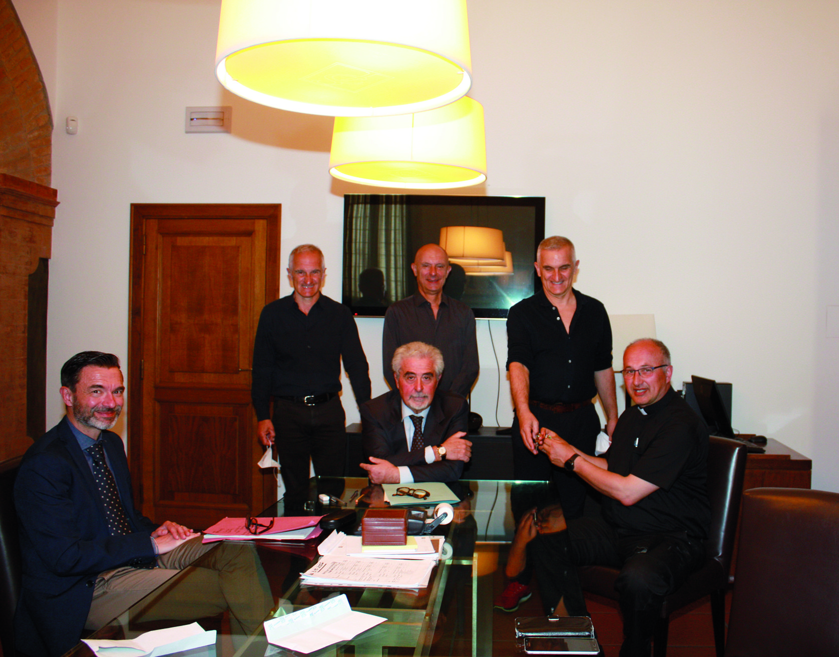 Nella foto sotto, il momento della firma dell’atto alla presenza dei fratelli Farabegoli, (Andrea, Enrico e Franco), di don Marco Muratori (in rappresentanza della Curia) di Andrea Lucchi (dirigente dei servizi amministrativi del Comune di Cesena) e del notaio Antonio Porfiri.