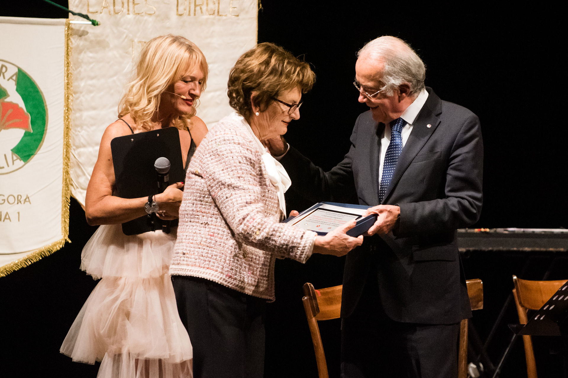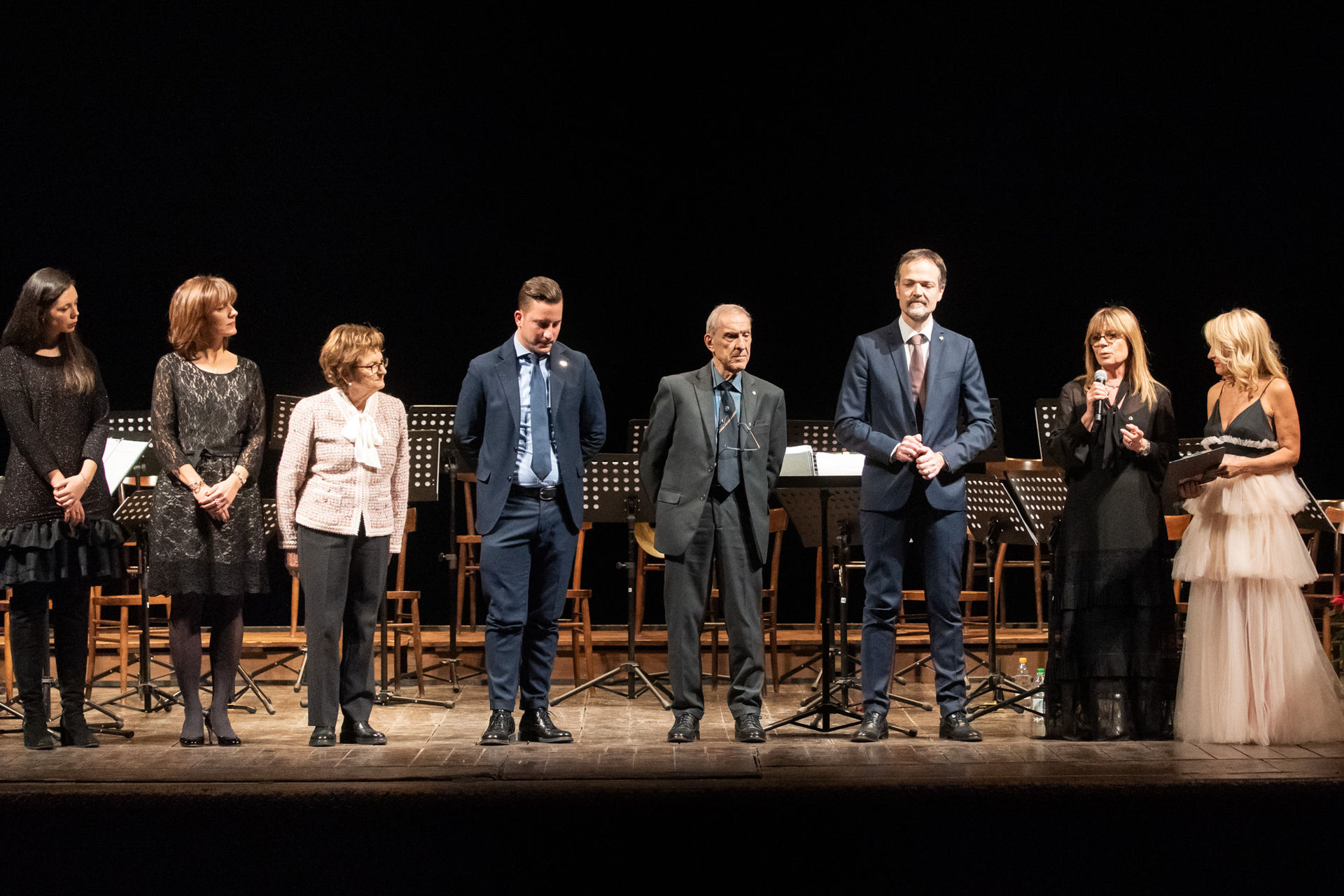Sul palco sono saliti i presidenti (qui sotto nella foto con la presentatrice, a destra, Fabiola Casadei) dei sette club che da nove anni danno vita alla serata: Rotary, Lions, Rotaract, Panathlon, Agorà, Round Table, Ladies’ Circle.