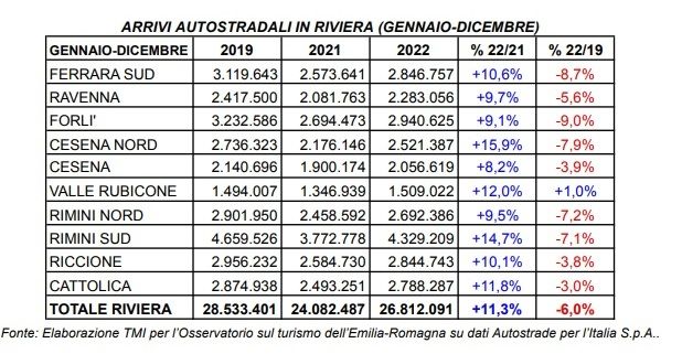 Anche i dati sull’andamento del movimento autostradale nel 2022 registrano una conferma degli altri indicatori. Gli autoveicoli in uscita ai caselli autostradali della Riviera dell’Emilia-Romagna nel periodo gennaio-dicembre 2022 registrano una crescita complessiva del +11,3% rispetto al 2021, mentre il gap con il 2019 si riduce al -6%.