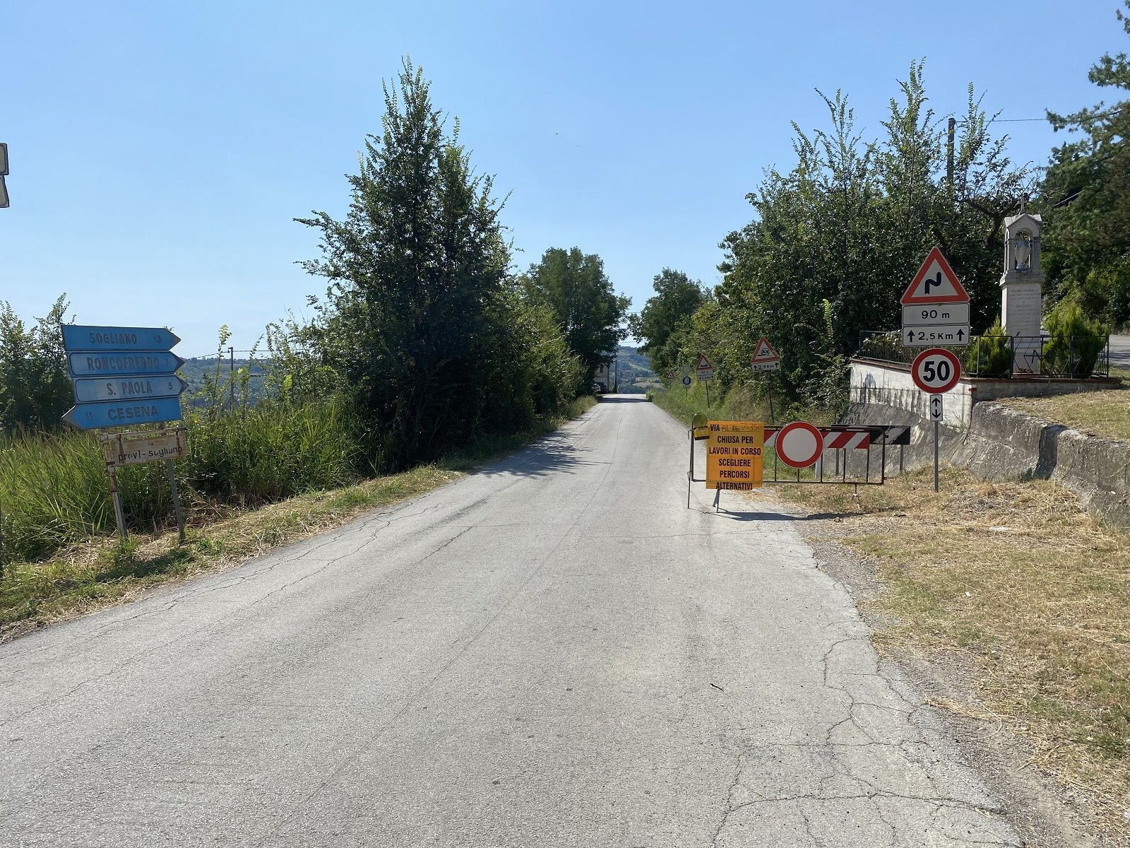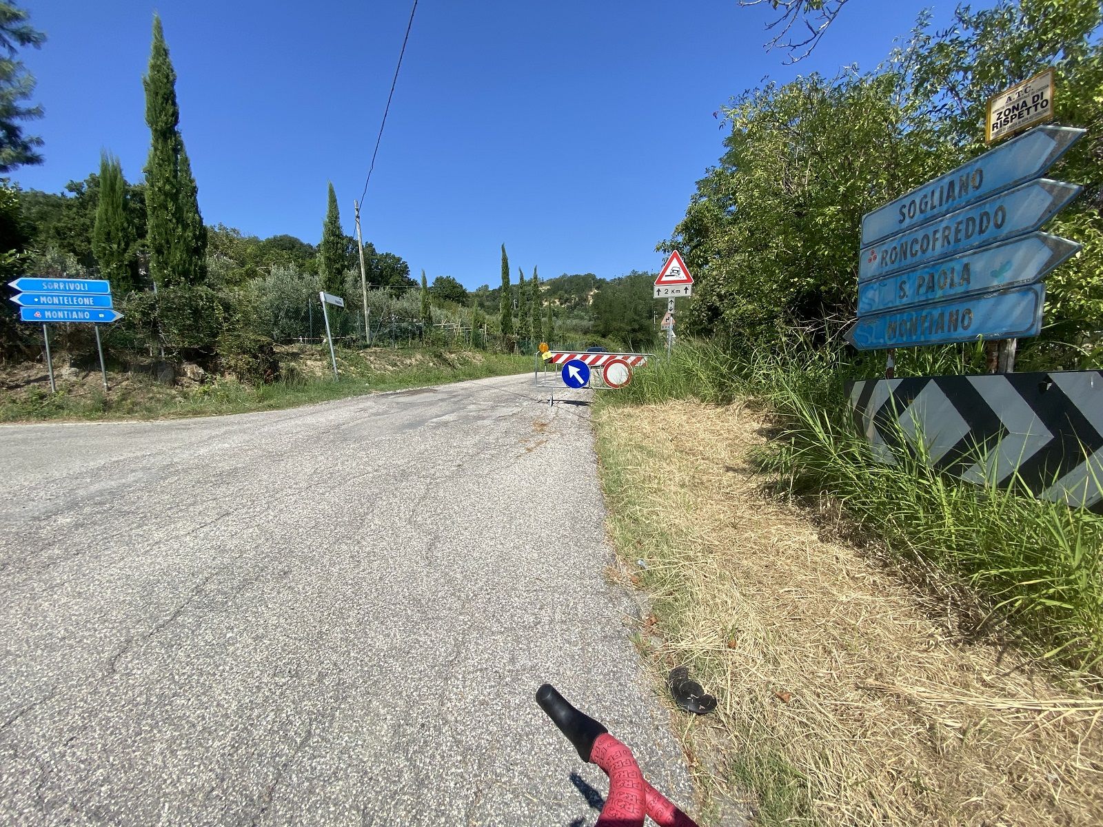 Fuori dall’abitato della frazione di Santa Paola, se si prende la strada a destra per tornare verso Montiano, al bivio della cosiddetta “Ciochina” che porta a Monteleone e a Ciola Araldi/Farneto si trova il cartello che ci si vede qui sotto. La situazione è la medesima da diverse settimane, come qui abbiamo scritto in diverse occasioni.