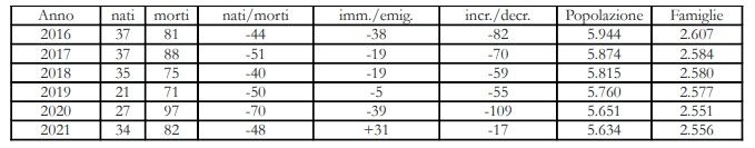 Secondo i dati, il saldo finale complessivo del 2021 è negativo di (-) 17 cittadini. È invece aumentato di 5 nuclei familiari il saldo finale delle famiglie che passa da 2.551 a 2.556. Anche nel 2021 continua il trend negativo della popolazione residente, commenta il sindaco “seppur in modo più marginale rispetto agli anni passati, ma secondo un fenomeno progressivo che sta “erodendo” ogni anno il numero dei cittadini, con maggior riferimento al saldo naturale, che “sconta” uno storico di poche nascite rispetto invece ai numerosi decessi”.