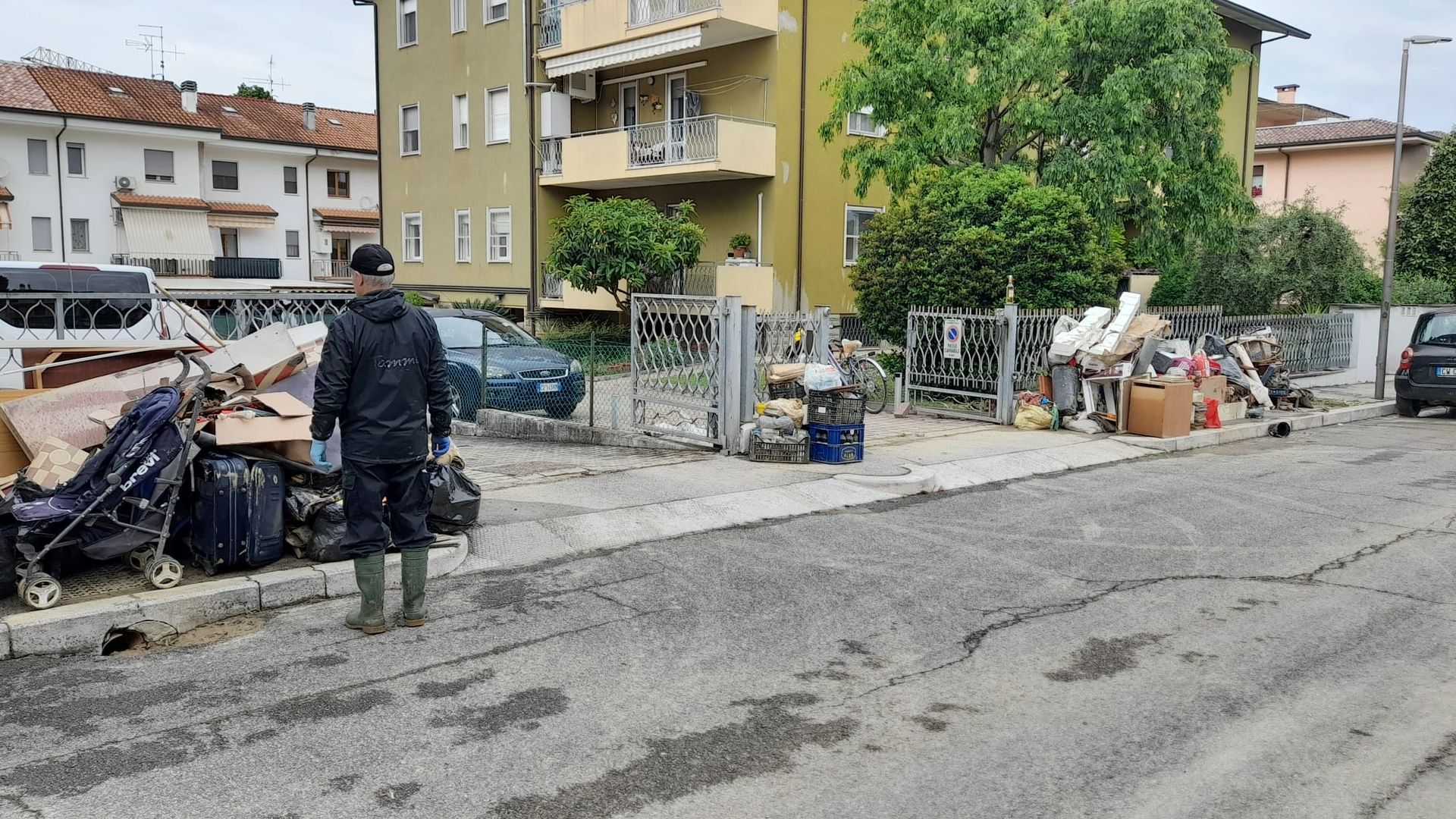 In via Tavolicci, traversa di via del Lavoro, si sgomberano scantinati e garage dall’acqua e dal fango. Nella foto, un residente guarda sconsolato il cumulo di materiale deteriorato.