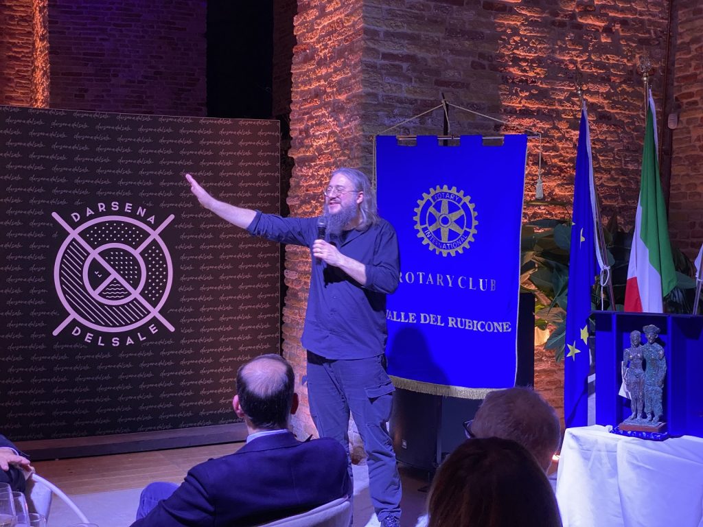 Il Premio del Rotary club Valle del Rubicone ha varcato la soglia dei 20 anni. Il primo venne riconosciuto nell’annata 2003-2004 a Riccarda Casadei in occasione dei 50 anni di “Romagna mia” composta dal padre Secondo. Poi è seguita una serie di insigniti, tutti di grande valore, tra cui si possono citare il nunzio apostolico Pietro Sambi, il musicista Andrea Guerra, l’azienda Technogym, lo stilista Giuseppe Zanotti, l’architetto Ilario Fioravanti. Di fronte a nomi così illustri, il premiato di ieri sera a Cervia alla Darsena del sale, durante la conviviale per gli auguri di Natale del club guidato quest’anno dall’architetto di Gambettola, Andrea Prati, l’artista Roberto Mercadini, ha mostrato tutta la sua commozione. “Mi pare una serie di beniamini -dice tra l’incredulo e il sorpreso -. Qui in Romagna ci si tiene agli artisti, come accade poco di frequente in altre parti d’Italia. Ho visto nella bottega dei Pascucci, a Gambettola, tre statuette. Una era di Tonino Guerra, un’altra di Ilario Fioravanti, la terza di Gianfranco Zavalloni. Ma chi le avrebbe esposte, se non in Romagna? Una sorta di santi laici”.