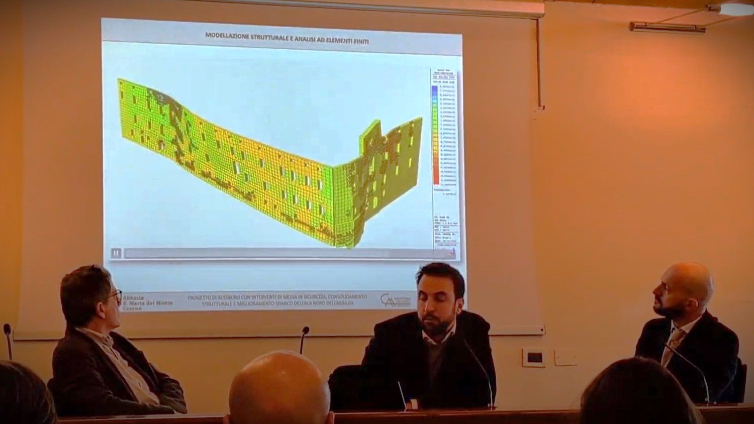 L’ingegnere Marco Mocellini (foto sotto) ha parlato di «quadro fessurativo importante, con lesioni e spanciamenti riconducibili a movimenti fondazionali». In pratica, l’abbazia poggia su di un terreno marnoso con una forte componente di gesso, soggetto a variazioni a seguito di forti piogge. Dunque, la muratura “balla” seguendo gli scostamenti del terreno. «Per questo inseriremo una cinturazione alla base della fondazione, poi procederemo con tiranti alle pareti».