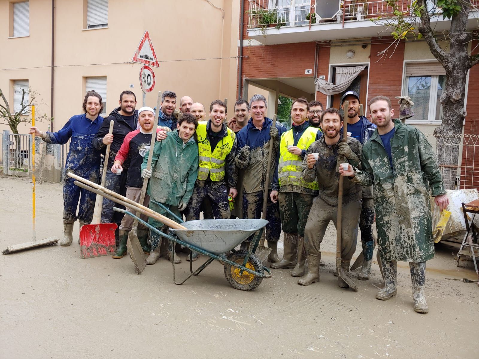 L’alluvione ha cambiato le carte in tavola. Il ritrovo si è tenuto lo stesso ma, al posto di pallonate e birre, il gruppetto ha imbracciato le pale mettendosi a disposizione dei cittadini alluvionati in via Ex Tiro a Segno (parrocchia di San Rocco).