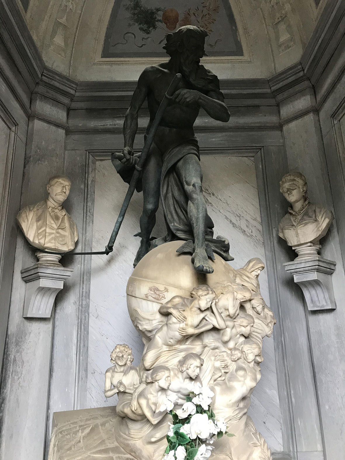 “E’ soprattutto nel campo della scultura ─ ha sottolineato Spazzoli, che ha portato l’attenzione dei visitatori su una ventina di monumenti funebri tra i tanti degni di menzione ─ che il nostro cimitero vanta la più vasta e importante collezione di opere dei maggiori artisti cesenati dell’Ottocento e Novecento. Tra questi, Tullo Golfarelli, la cui composizione più scenografica si trova nella Cappella Bartoletti che ospita i resti di tre giovani morti nel primo conflitto mondiale. Si tratta di una statua in bronzo che raffigura il Tempo che incombe su chi guarda e sembra volerlo ghermire con la lunga falce arcuata. Si erge sopra un globo di marmo attorno a cui ruota una spirale di anime che richiama la schiera dei lussuriosi incontrati da Dante nel canto V dell’Inferno. E in basso una figura di donna simboleggia la Terra”. La scultura venne apprezzata anche dal poeta Giovanni Pascoli.