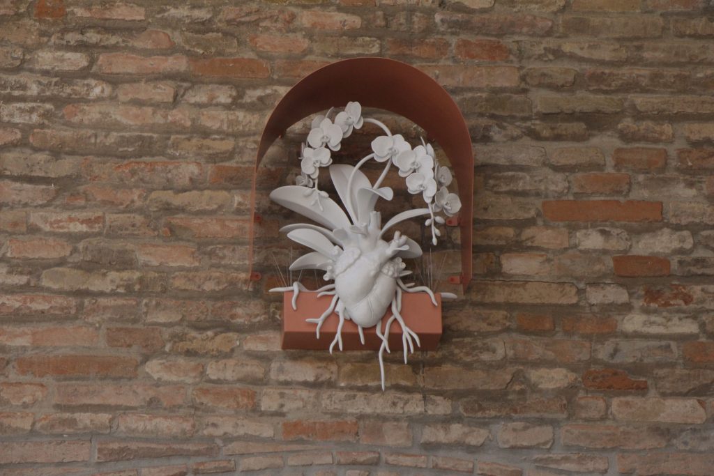 “Questo è diventato un mondo in cui tutto è anche il suo opposto – commenta Marcantonio, l’artista – Un mondo in cui se notiamo una cosa è perché ce ne ricorda un’altra, viviamo tra simboli o icone che hanno un significato, forse, ma di sicuro poco valore. Per me disorientante. Abbiamo bisogno di immagini chiare, poetiche, semplici e pure, per contrastare tutto ciò che di brutto vediamo ogni giorno. Credo che questo sia il compito della bellezza. Il cuore è vita ed è tanto altro, ci fa vivere la passione, l’emozione, l’amore e la bontà, è così carico di significato da essere già simbolo di sé stesso. È per questo che ho iniziato a scolpire una lunga serie di cuori, dal 2007 ad oggi, perché, per mia necessità, già allora, avevo bisogno di soggetti reali ed importanti, soggetti resi sculture per renderli certezze intorno a me. Ci Vuole Cuore, come dirlo in un altro modo? In questa composizione, ‘Cuore con Orchidea’, in ricordo di Carlotta, il cuore germoglia, è un cuore florido pronto a dare e, al contempo, ci ricorda che tutto è figlio di una stessa natura, fiori ed esseri umani, tutto è collegato. Ci ricorda che le vene sembrano radici e che quindi la bellezza è anche riconoscersi in ciò che stiamo osservando, anche se sembra diverso da noi”.
