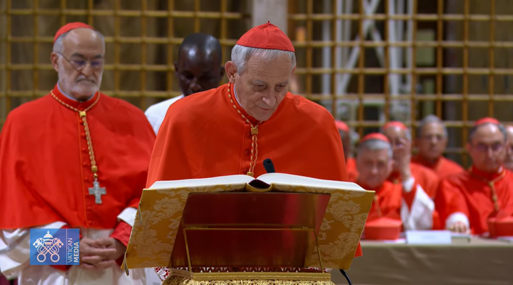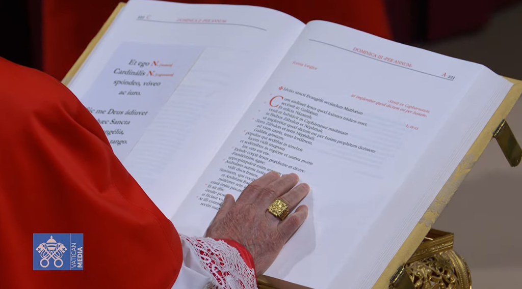 Dal posto, segue il giuramento, tutti insieme, guidato al microfono dal cardinale Pietro Parolin. Ciascun porporato poi si alza e pronuncia l’ultima parte del giuramento toccando l’Evangeliario. La formula del giuramento viene letta prima dal cardinale Parolin e poi da ciascuno dei cardinali elettori: «Et ego N. Cardinalis N. spondeo, voveo ac iuro» («Ed io N. Cardinale N. prometto, mi obbligo e giuro»). «Sic me Deus adiuvet et haec Sancta Dei Evangelia, quae manu mea tango» («Così Dio mi aiuti e questi Santi Evangeli che tocco con la mia mano»).