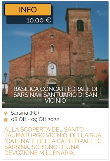 In Diocesi aderisce solo la Basilica concattedrale di Sarsina, Santuario di San Vicinio. Sabato 8 e domenica 9 ottobresi apre per mostrare la sua essenza più autentica e devozionale: ripercorreremo le origini del culto di san Vicinio, protovescovo e patrono della città di Sarsina, dove giunse dalla Liguria intorno al V secolo e dove trascorse la sua esistenza terrena praticando la povertà e liberando gli oppressi da influssi demoniaci.