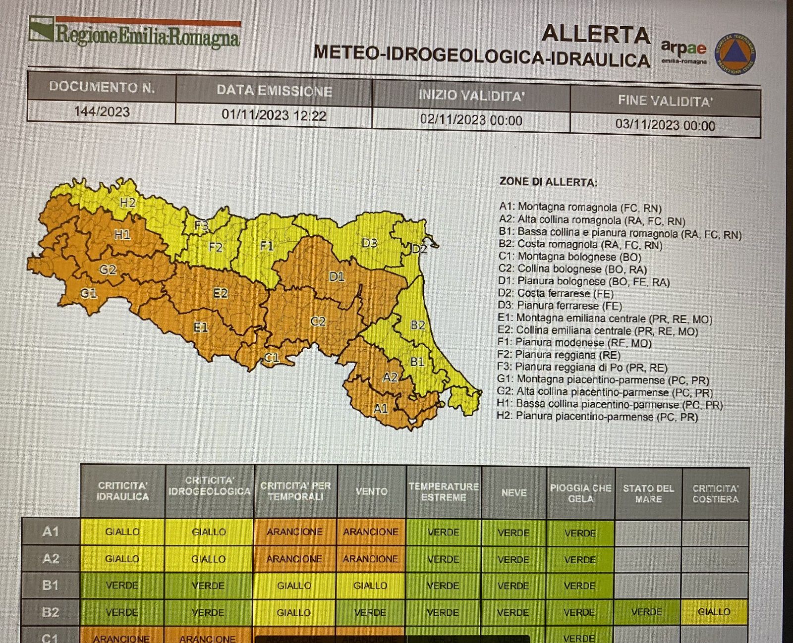 Stato di allerta arancione per frane e piene dei corsi minori per la giornata di domani giovedì 2 novembre in tutto l’Appennino emiliano, nello specifico nei territori di montagna delle province di Piacenza, Parma, Reggio Emilia, Modena e Bologna. Lo rende noto anche la Regione con un proprio comunicato stampa diffuso oggi pomeriggio.