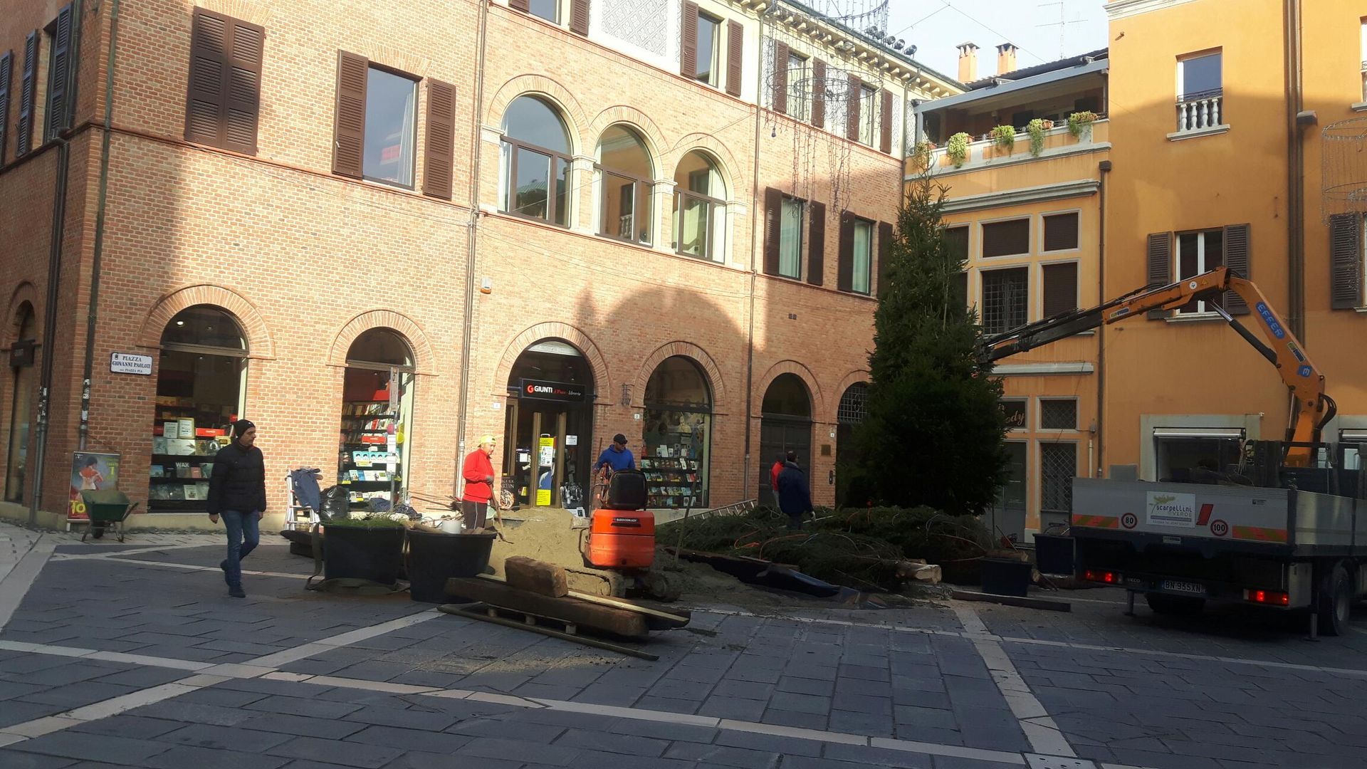 Procedono alacremente, da questa mattina, gli allestimenti del presepe in piazza Giovanni Paolo II, di fronte alla Cattedrale di Cesena.