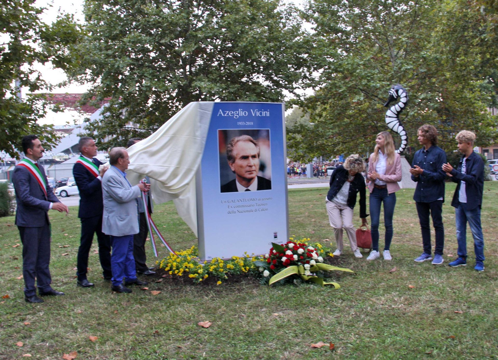 Cesena e Cesenatico nel segno dello sport e della solidarietà hanno reso omaggio all’ex ct, il cesenate Azeglio Vicini. Domenica le due città hanno omaggiato il commissario tecnico delle notti magiche di Italia ’90 intitolandogli due rotonde. A Cesena l’iscrizione è stata collocata nella rotonda dello Stadio (in foto). L’inaugurazione è avvenuta alle 7 del mattino prima che gli atleti dessero il via alla Maratona Alzheimer in direzione Cesenatico. Nella città balneare invece la cerimonia è avvenuta nella rotonda posta all’incrocio fra viale Roma e viale Carducci intorno alle 12,45.