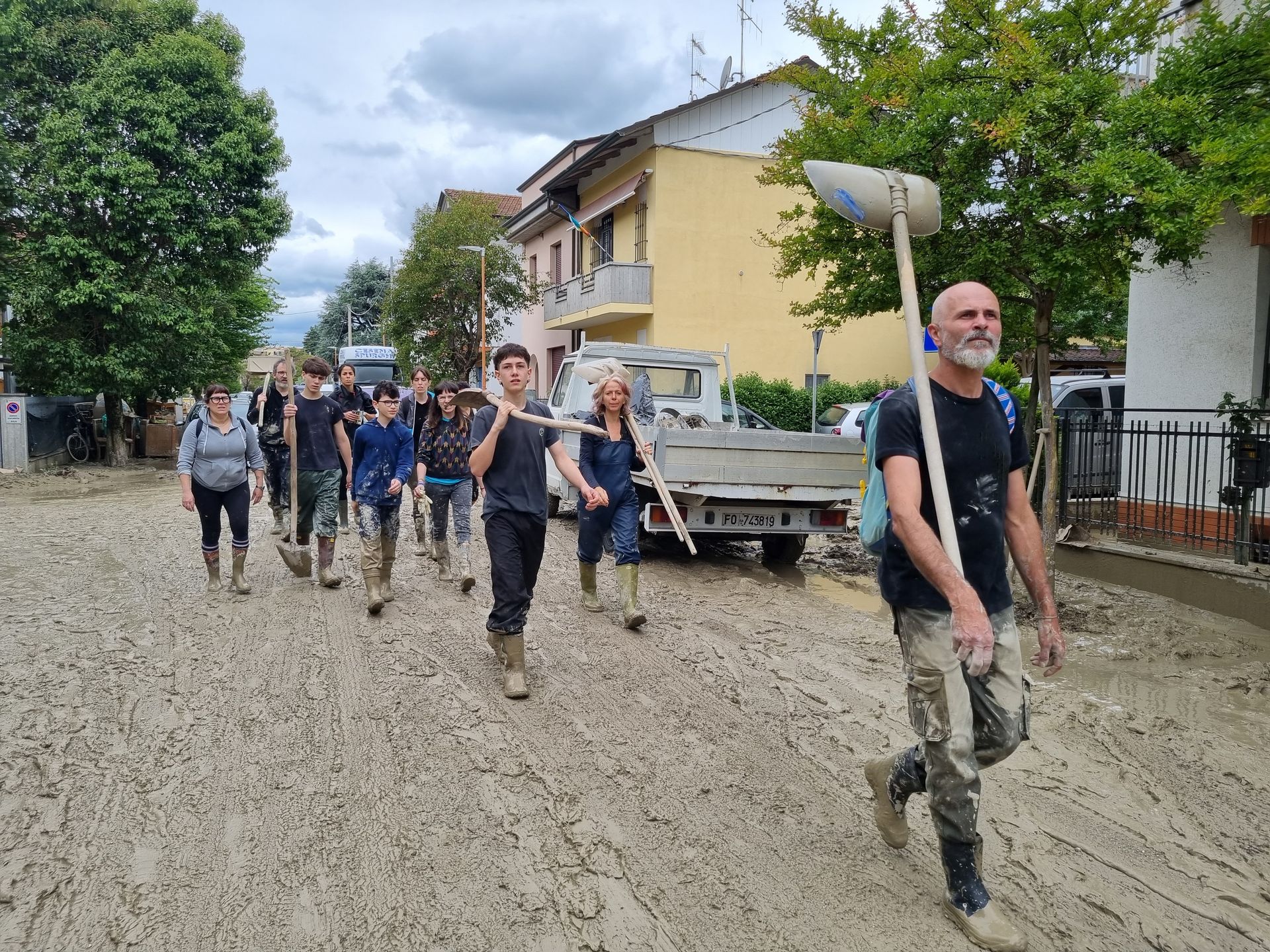 Grandi lavori nelle zone alluvionate di Cesena per ripulire strade e case dall’acqua e dal fango. Tanti giovani e intere famiglie all’opera con badili, ramazze e buona volontà.