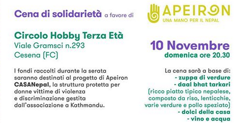 Si terrà domenica 10 novembre alle 20,30, presso il Circolo Hobby Terza Età in viale Gramsci 293, a Cesena, la cena di solidarietà a favore dell’associazione Apeiron. I fondi raccolti durante la serata saranno destinati al progetto di Apeiron “CasaNepal”, la struttura protetta per donne vittime di violenza e discrizionale gestita dall’associazione a Katmandu.