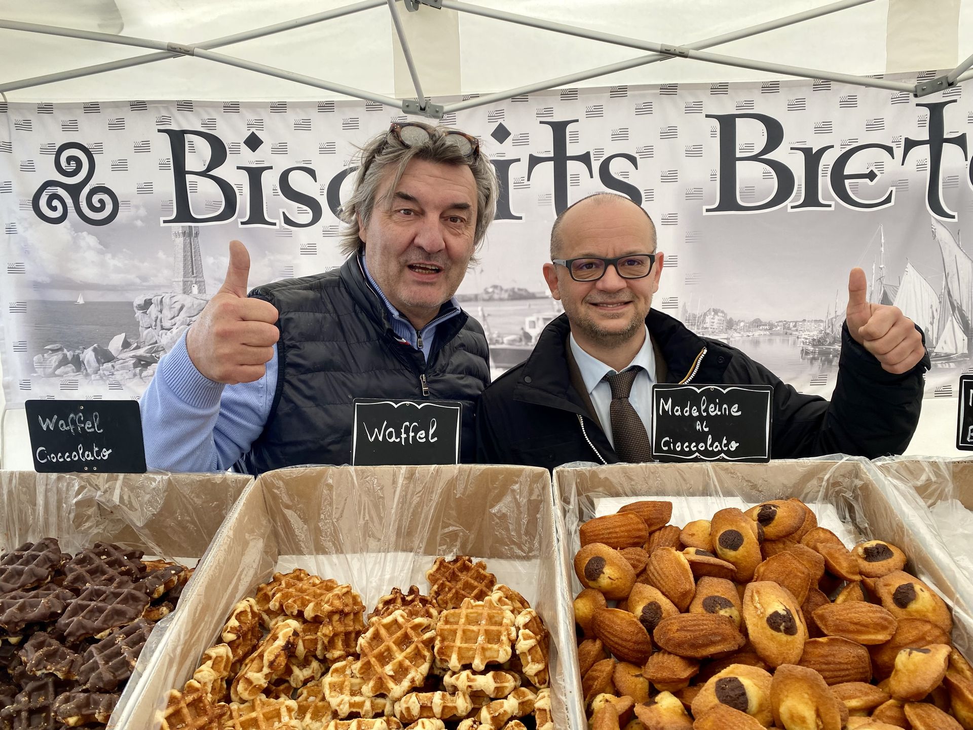 I prodotti legati all’enogastronomia francese rappresentano il cuore del mercatino. Oltre 80 i tipi di formaggio presenti, dal Mont d’Or, con la tipica confezione di legno, al Rocamadour del Midi Pyrénéés, dal Camembert della Normandia, al Brie della Ile de France. Anche i vini sono presentati in oltre 30 varianti, dallo Champagne al Bordeaux fino al Sidro. I salumi hanno particolari tipi di produzione che abbinano spezie ed erbe aromatiche. L’offerta dei biscotti Bretoni può contare su oltre 20 varietà diverse di ripieno: dal cocco al sesamo, dal cioccolato al limone. Una grande tavolozza di colori è rappresentata dallo stand delle spezie, le quali provengono, nella maggior parte dei casi, dalle ex colonie francesi. Da non perdere è lo spazio dedicato alle crepes e alla gastronomia, tutte specialità da degustare calde. A conclusione dello spazio enogastronomico non poteva mancare la baguette, calda, appena sfornata.