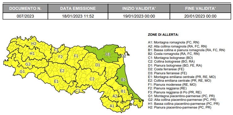 Saranno possibili nevicate fino in pianura sul settore centro-occidentale con accumuli mediamente intorno a 5 centimetri e punte localmente superiori, mentre sul settore orientale si avrà in prevalenza pioggia mista a neve con accumuli scarsi o nulli. Sono inoltre previsti venti di burrasca moderata (62-74 chilometri orari) da nord-est lungo la costa, in particolare ferrarese, con temporanee raffiche di intensità superiore. Si prevedono in serata condizioni del mare sotto costa che possono generare localizzati superamenti della soglia di allertamento. Non si escludono infine livelli idrometrici prossimi alla soglia 1 nei bacini del settore centro-orientale della regione.