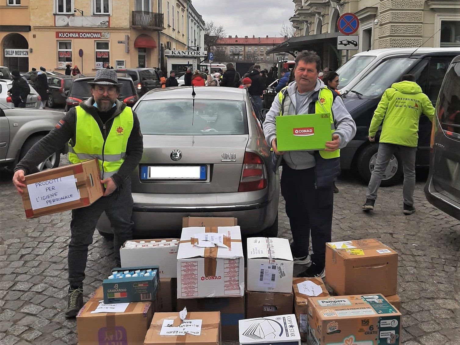 “Non potevamo certo restare indifferenti – spiega al telefono Casadei, responsabile dei centri di accoglienza della Caritas di Cesena-Sarsina –. Prima di partire, d’accordo con il direttore della Caritas, ho raccolto con l’amico polacco Jacek una quindicina di pacchi da consegnare alla Caritas polacca. Da alcuni medici cesenati, tra cui la dottoressa Federica Fabbri, abbiamo preso beni di primo soccorso, come bende e garze. Abbiamo aggiunto prodotti per l’igiene personale e vestiti per i bambini. Ho ritirato poi alcuni scatoloni già pronti dalla Caritas di Sant’Egidio e da quella di Gambettola, molto attiva su questo fronte, riempiendo all’inverosimile la Skoda Superb di Jacek”.