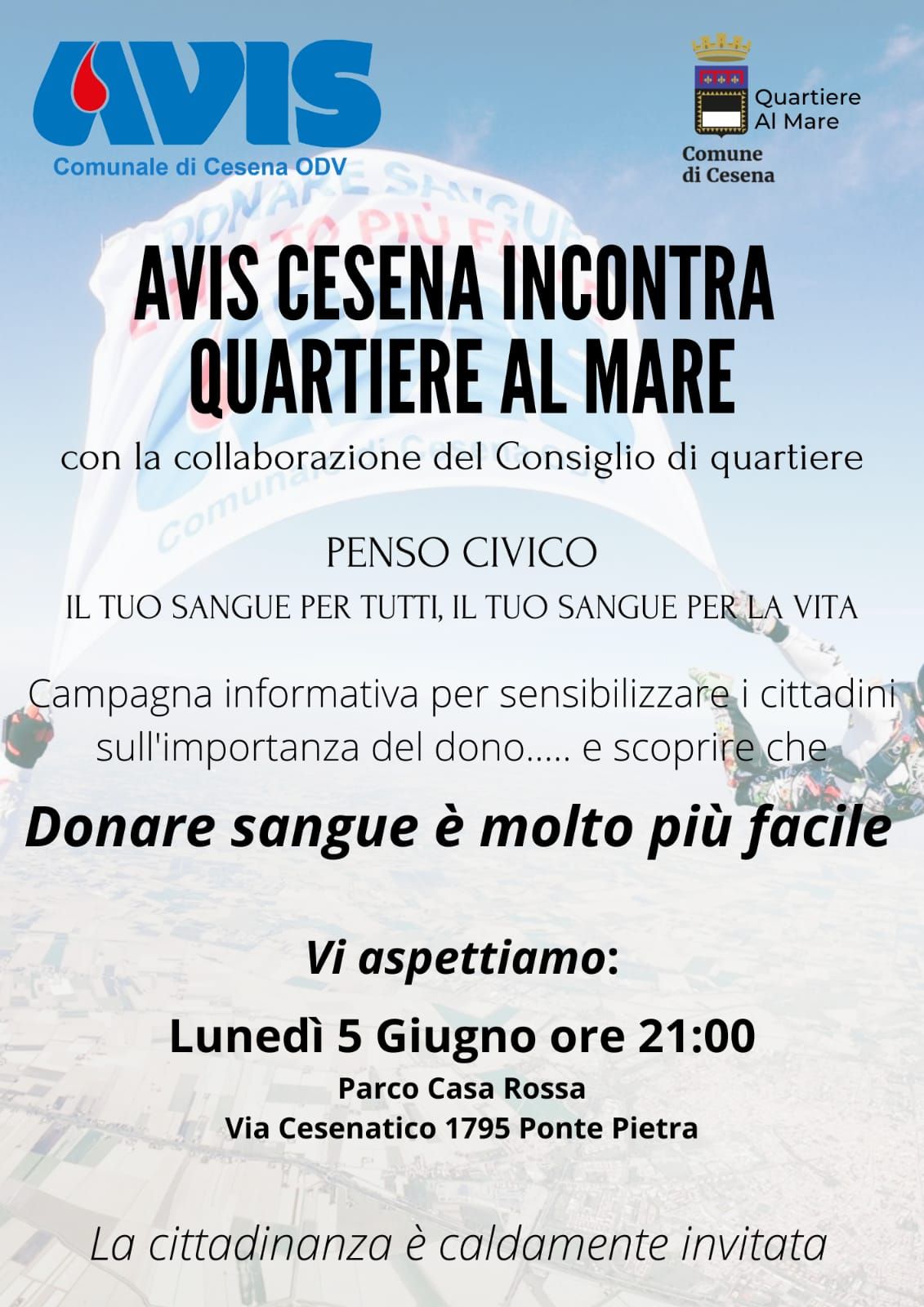 Lunedì 5 giugno alle 21 al parco Casa Rossa, in via Cesenatico 1795, a Ponte Pietra Avis incontrerà il quartiere Al mare per una serata di informazione sul tema “Penso civico. Il tuo sangue per tutti, il tuo sangue per la vita”.