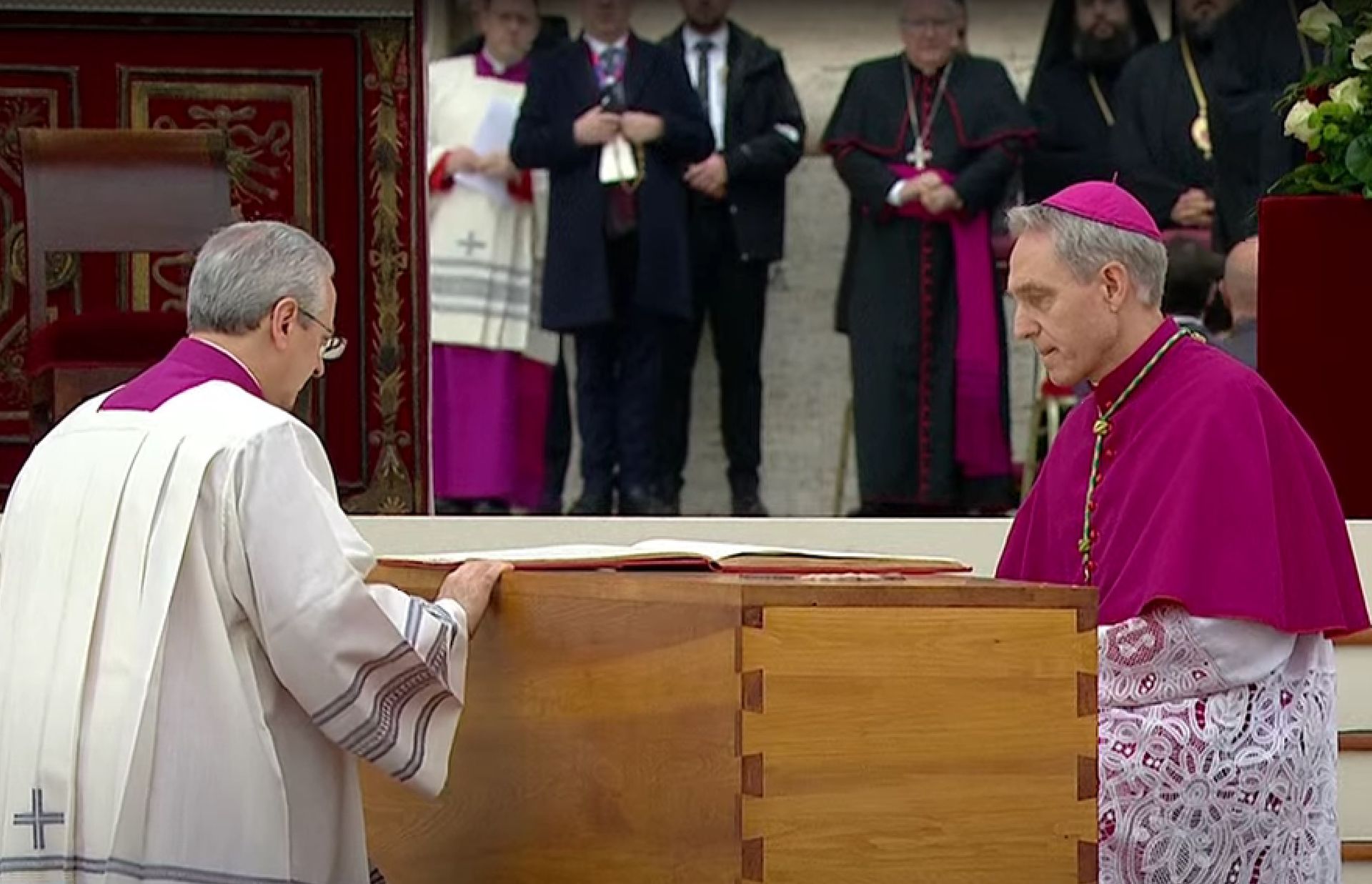 Alle 8,50 in punto, come da cerimoniale, la bara di cipresso con le spoglie del Papa emerito Benedetto XVI è stata trasportata dalla basilica sul sagrato dai sediarii, i Gentiluomini di Sua Santità. Dalla piazza, già piena, e dai cardinali, vescovi e sacerdoti presenti è partito subito un caloroso applauso, che si è ripetuto più volte, e in particolare quando monsignor Georg Gänswein, segretario particolare del Papa emerito, ha adagiato e aperto il Vangelo sulla bara, deposta al centro del sagrato, e si è inginocchiato per baciarla (foto). Poi la folla di fedeli ha cominciato a recitare il Rosario. Sullo sfondo, il suono delle campane a morto provenienti dalla basilica.