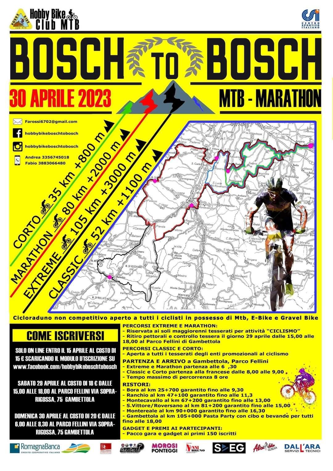 Il prossimo 30 aprile ci sarà da sudare per i biker che parteciperanno alla “Bosch to Bosch”. Alle 6,15 del mattino, con partenza e arrivo a Gambettola, si disputerà la sfida non competitiva per gli appassionati di mountain bike ma non solo.