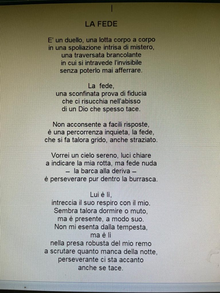 Qui sotto la poesia di Franco Casadei, “La fede”, letta ieri sera, sul finire dell’incontro.