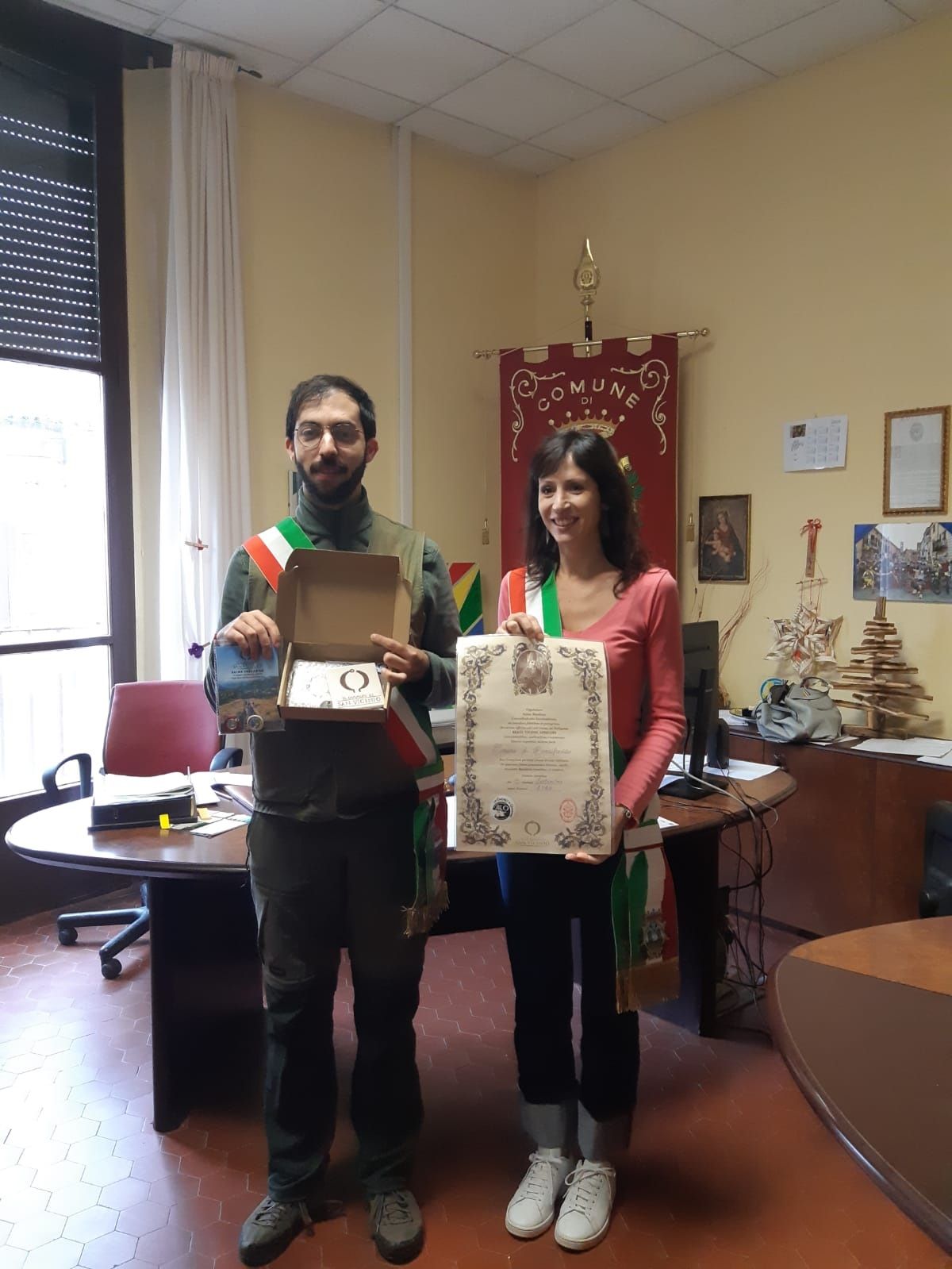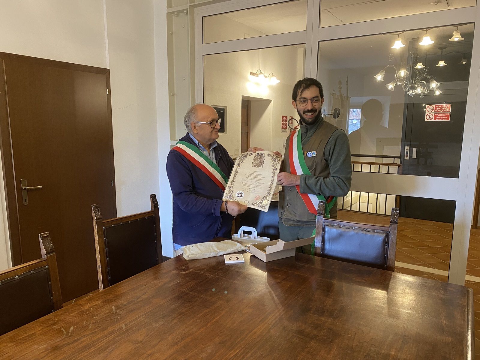 Poi a Montiano, con il collega Fabio Molari. I due primi cittadini sono gli unici del nostro territorio a essersi candidati senza avere avversari. Cangini ha offerto al collega la pergamena del Cammino e le mattonelle (foto qui sotto) da posizionare lungo il paese. In risposta Molari ha donato al sindaco e ai suoi accompagnatori un volume su Montiano e una tela stampata di Pascucci di Gambettola.