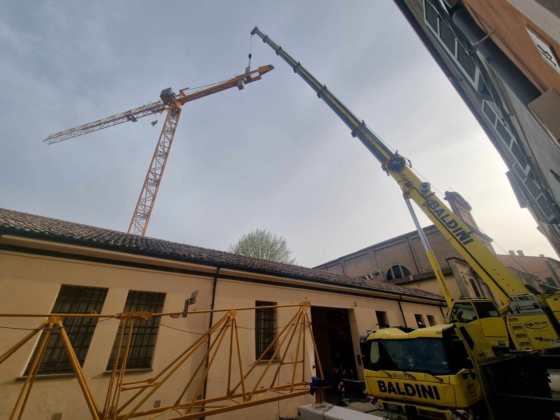 È in corso in centro storico a Cesena il montaggio della gru necessaria all’esecuzione dei lavori al cantiere di Palazzo Roverella.