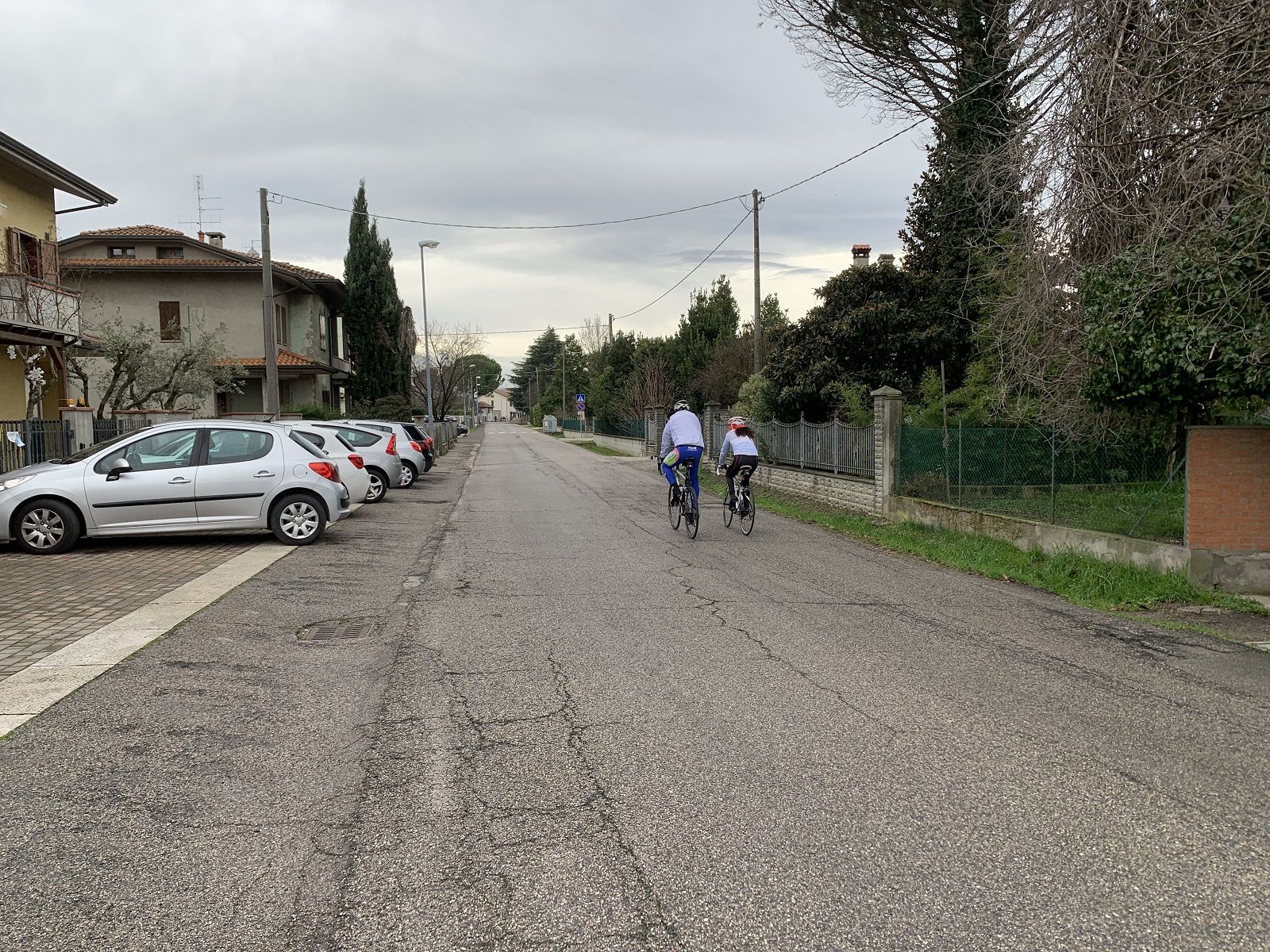 La foto sotto riprende due ciclisti lungo la via Capannaguzzo, poco prima dell’istituto delle Missioni Consolata.