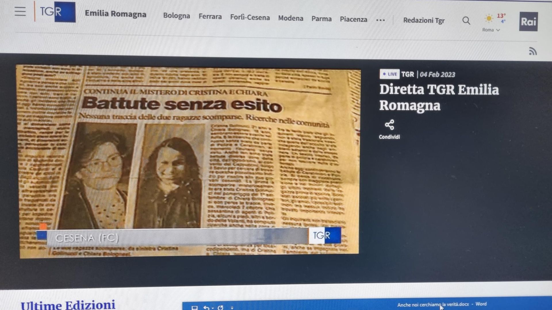 “Anche noi cerchiamo la verità”. È di pochi minuti fa il servizio del Tg Rai Regionale, andato in onda nell’edizione delle 14, in cui Francesco Zanotti, direttore del Corriere Cesenate e direttore dell’Ufficio diocesano per le Comunicazioni sociali, si è fatto portavoce della Diocesi a proposito dei nuovi sviluppi nelle indagini sui casi di sparizione di Cristina Golinucci e di Chiara Bolognesi, giovani cesenati scomparse a un mese di distanza nel 1992. Il corpo di Chiara venne ritrovato tre settimane dopo nel fiume Savio e venne considerato un caso di suicidio. Di Cristina non si seppe più nulla.