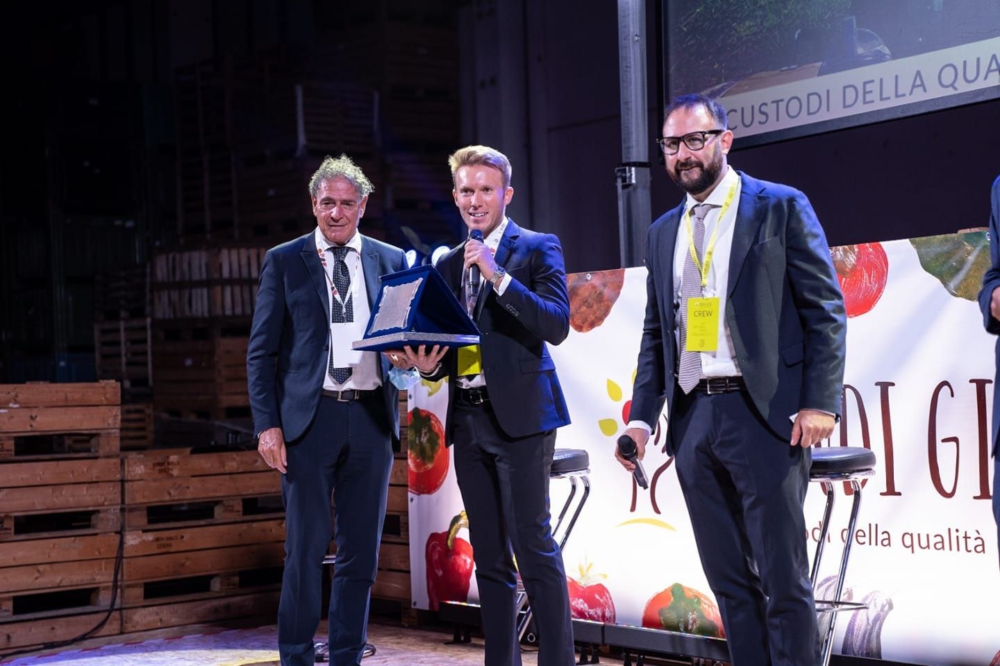 Una targa al merito imprenditoriale consegnata al socio titolare Gianluca Biondi dal presidente Confcommercio cesenate Augusto Patrignani per suggellare la festa dei 75 anni della Biondi Giulio, impresa agroalimentare storica del territorio cesenate celebratasi nel salone dello stabilimento di Pievesestina.Hanno portato il saluto il sindaco Enzo Lattuca, accompagnato dall’assessore allo sviluppo economico Luca Ferrini, che ha elogiato lo spirito imprenditoriale di una dinastia che tiene alto il nome della città e si è annoverato tra i clienti del negozio di corso Cavour; la consigliera regionale Lia Montalti nonché il presidente Augusto Patrignani, presidente di Confcommercio, a cui la Biondi Giulio è associata, entrambe radicate in città dal 1945. “Sono stato anche loro concorrente quando avevo un’attività similare in corso Sozzi alla fine degli anni Settanta – ha ricordato – e già allora ero ben consapevole che era un’azienda seria e attrezzata”.Nella Cesena a spiccata vocazione agroalimentare, è stato messo in luce in tutti gli interventi che la ‘Biondi Giulio’ è un tassello rilevante del mosaico produttivo e distributivo, così come è stato importante il suo contributo alla crescita del mercato ortofrutticolo.Gianluca Biondi ha ripercorso le tappe di fondazione e radicamento e sviluppo dell’impresa, tra crescita e inevitabili traversie, avviata in una città con ancora le macerie fumanti della guerra dal nonno Giulio, detto Lucio, che aprì lo storico negozio di frutta e verdura di corso Cavour, tuttora un pilastro della rete distributiva al dettaglio, a cui si accompagna l’azienda agricola di 27 ettari. Gianluca Biondi ha ripercorso anche le tappe della fervida presenza all’interno del mercato ortofrutticolo.Tra il pubblico numeroso e ordinato, disposto in sala nel rispetto delle distanze e della precauzioni anti-covid, figuravano autorità politiche di tutti gli schieramenti, militari, religiose e rappresentanti del mondo economico, sociale e del volontariato a cui da sempre la famiglie Biondi è vicina, nonché amici e clienti provenienti da tutta ’Italia, addirittura da Ragusa. Commosso nella rievocazione di Gianluca Biondi, entrato in azienda nel 2016, è stato il ricordo oltreché del capostipite ‘Lucio’ anche del padre Mauro, venuto a mancare nel 2006. Al momento della premiazione sono saliti sul palco anche gli zii Rosanna, che ha preso la parola con applaudita immediatezza, e Gabriele, oltre alla mamma Loretta.Il direttore Matteo Evangelisti ha chiuso gli interventi zoomando sul futuro e ha rimarcato che, pur nelle facoltà scaturite dal Covid, la tenuta aziendale è stata più che buona e sono a buon punto nuovi progetti di innovazione e sviluppo aziendale che si innesteranno in un‘azienda con 45 dipendenti che fattura 15 milioni di euro. La proiezione di un video sulla Biondi Giulio proiettata nel futuro, lo spettacolo di Roberto Mercadini “Affabulazione botanica” e un piacevole momento conviviale hanno concluso la festa corale del 75esimo, con l’appunto immancabile per i prossimi 100 anni.