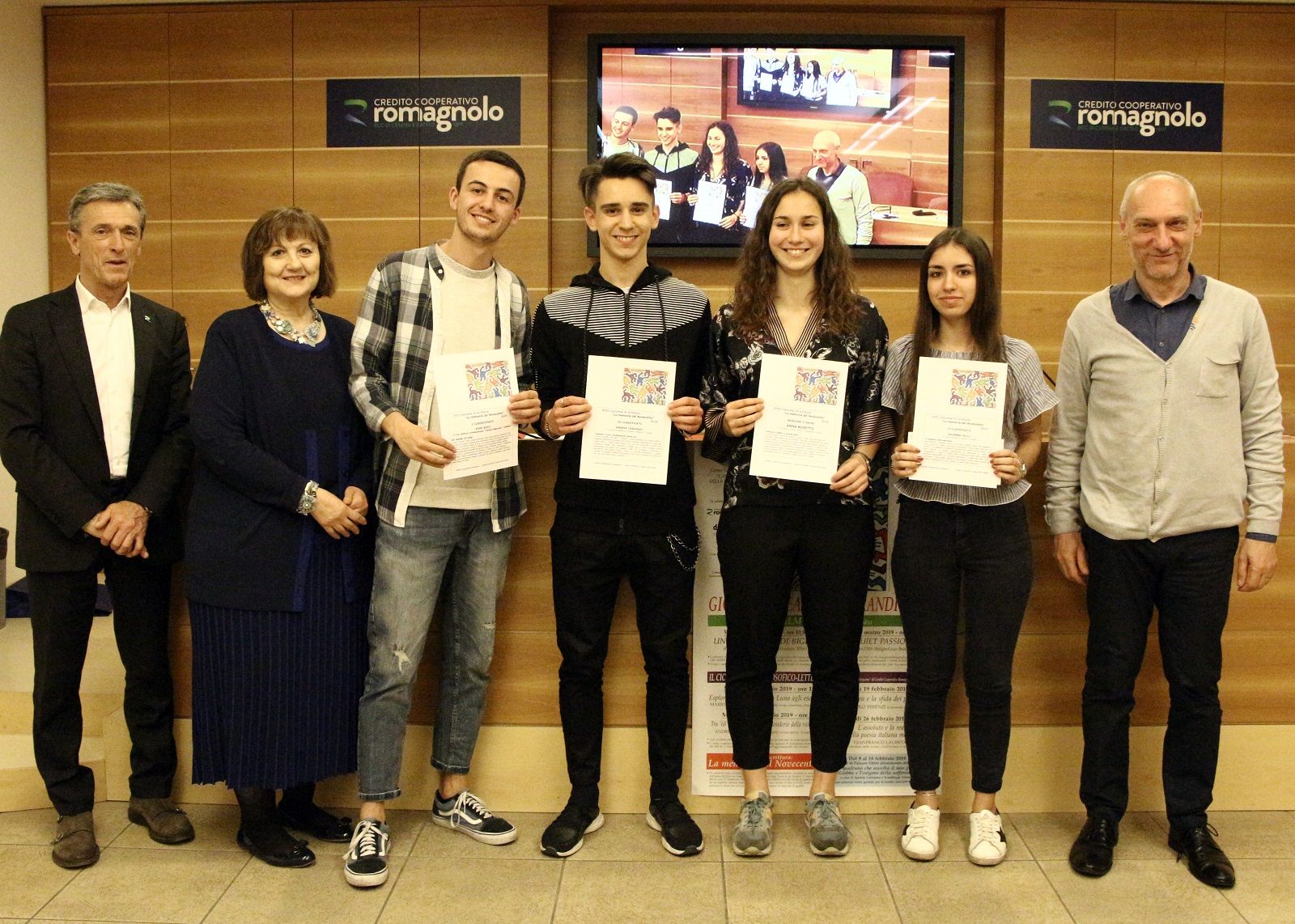 Nella foto (Sandra e Urbano – Cesena) sotto i quattro studenti premiati con, a sinistra, il presidente del Credito cooperativo romagnolo Valter Baraghini, la presidente del “Campo della stella” Ombretta Sternini e il presidente della commissione Gianfranco Lauretano.