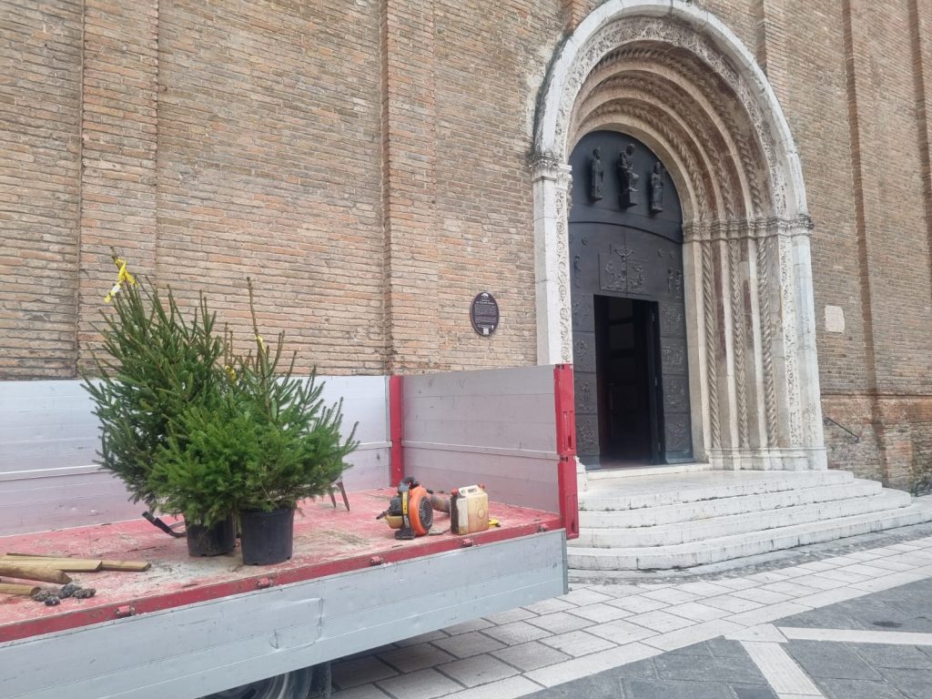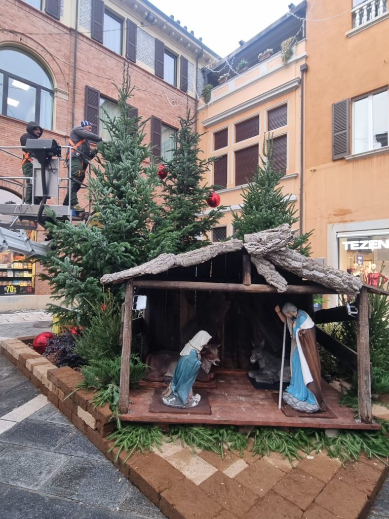 Sono iniziati i lavori di allestimento del presepe della Fondazione Cassa di risparmio di Cesena davanti al Duomo di Cesena.