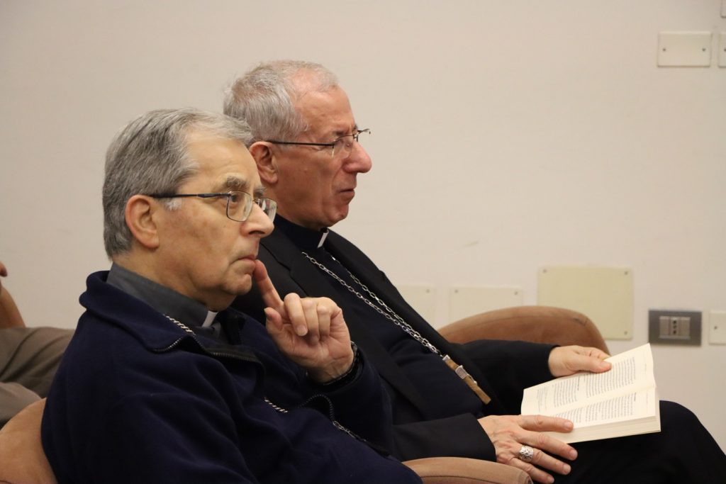 Nelle foto di Sandra&Urbano fotografi il vescovo emerito Douglas Regattieri e il vescovo Antonio Giuseppe Caiazzo. Sotto la sala conferenze Bcc Romagnolo dove si è svolto l’incontro