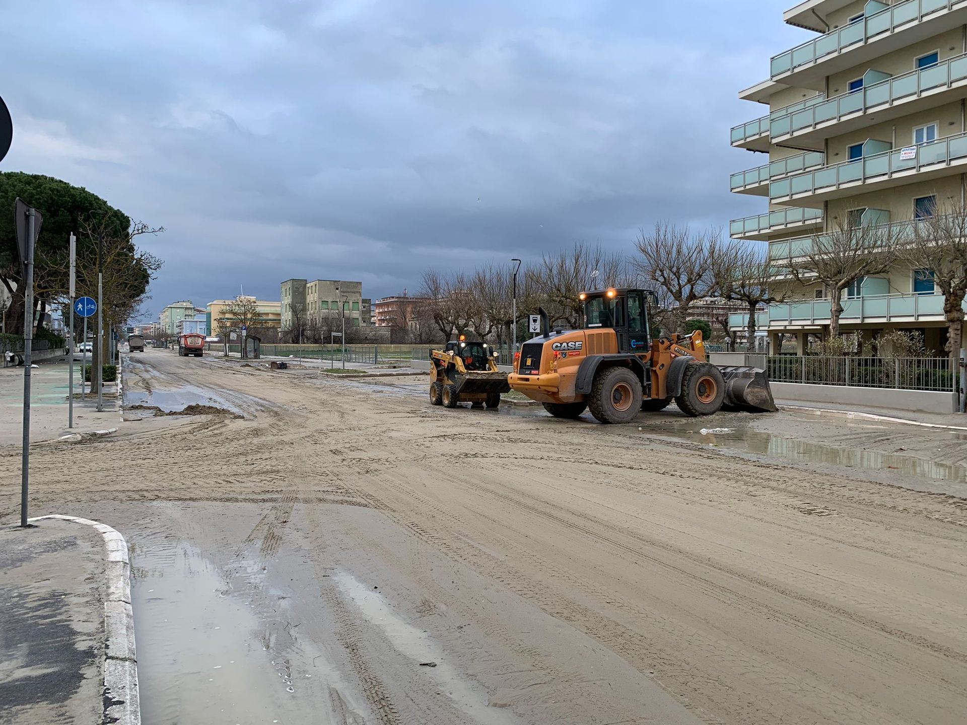 Sulla spiaggia di Valverde le ruspe delle ditte specializzate stanno lavorando in condizioni emergenziali per ripristinare la duna a protezione degli stabilimenti balneari e dell’abitato. I tecnici, che lavorano per conto del Comune di Cesenatico e della Regione Emilia-Romagna, contano di ripristinare le dune entro la giornata di domani. Gli operatori di Cesenatico Servizi stanno lavorando invece sulle strade per eliminare acqua, sabbia e detriti portati dal mare nei giorni scorsi.