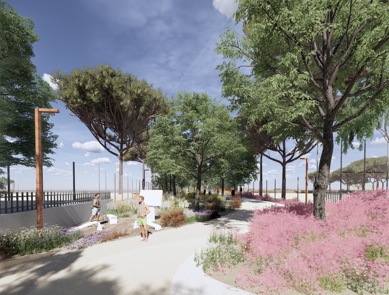 La ciclo-pedonalità prevale su tutte le scelte compositive e funzionali andando a creare continuità tra tessuto urbano e lungomare con la contestuale attenzione a nuove aree di parcheggio a raso per aumentare la funzionalità dell’area. Spazi generosi saranno riservati alle attività per il tempo libero e allo sport nel pieno rispetto della conservazione di eventuali elementi naturali. Il progetto prevede tante soluzioni vocate ad una sostenibilità ambientale: l’indicazione di un corridoio ecologico con specie vegetali d’alto fusto e specie verdi basse arbustive autoctone per ridurre le isole di calore, l’utilizzo di pavimentazioni drenanti e dai colori chiari e caldi delle terre per migliorare il microclima urbano, l’utilizzo di giardini della pioggia per ovviare al tema delle bombe d’acqua. Nel progetto è prevista inoltre la creazione di un nuovo ed accattivante sistema di dune sia per la definizione estetico-funzionale degli stradelli a mare, sia per la creazione del sistema di difesa costiero con dune a goccia o falciformi.