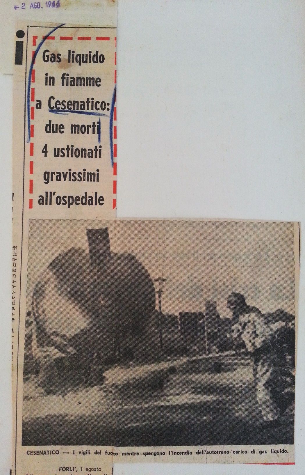 A Cesenatico, il 2 agosto 1966, nel bel mezzo della stagione balneare, durante il decennio del “boom economico”, nelle prime ore di un assolato pomeriggio, si verificò una delle più gravi tragedie registrate nella cittadina. Da un’autocisterna che trasportava gpl (gas di petrolio liquefatto) per rifornire la stazione di servizio lungo la statale Adriatica (ove è tuttora presente), a causa di un guasto, è improvvisamente fuoruscita una grande quantità di gas che ha preso fuoco, provocando la morte, nel giro di poche ore, di sei giovani vite.