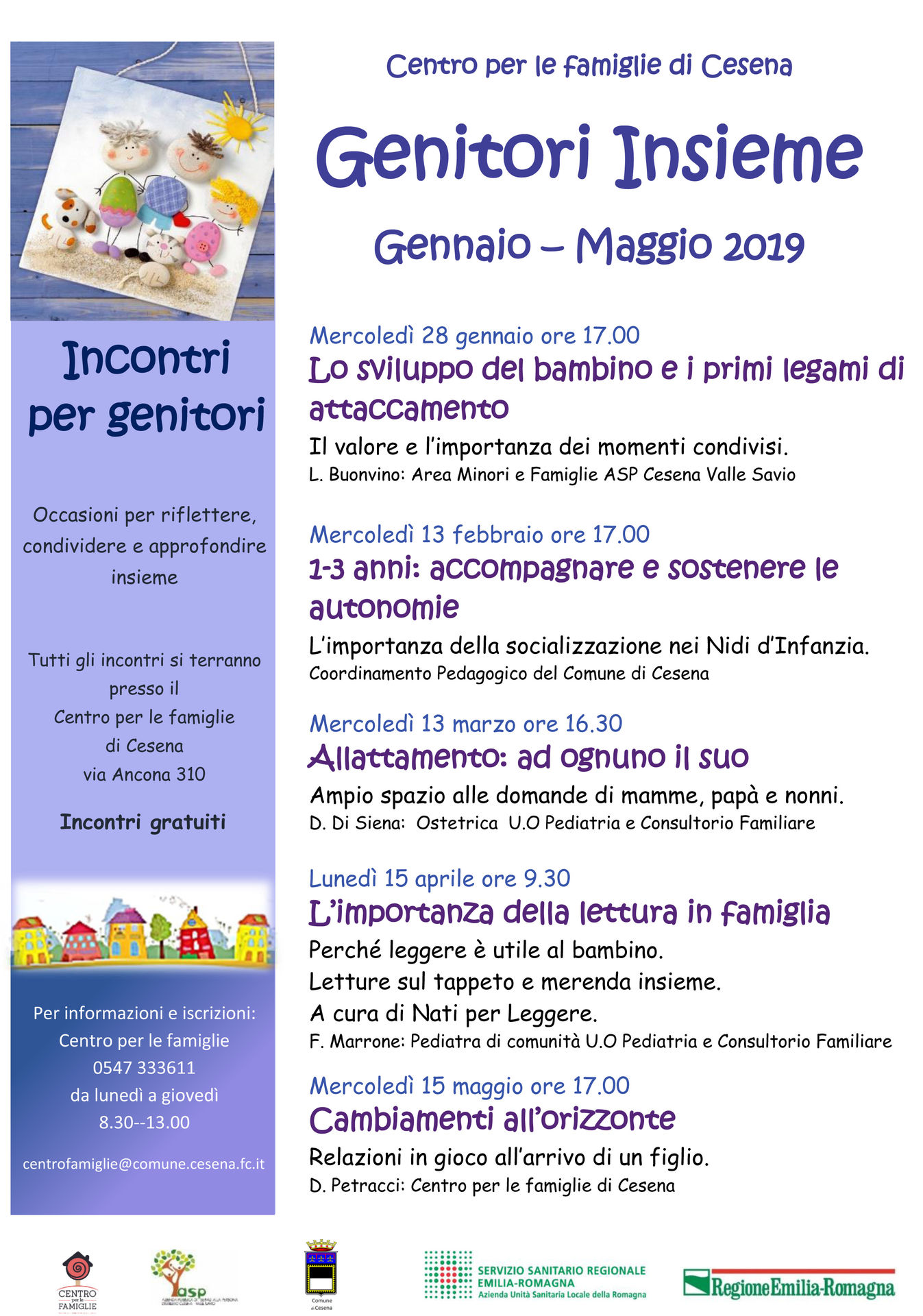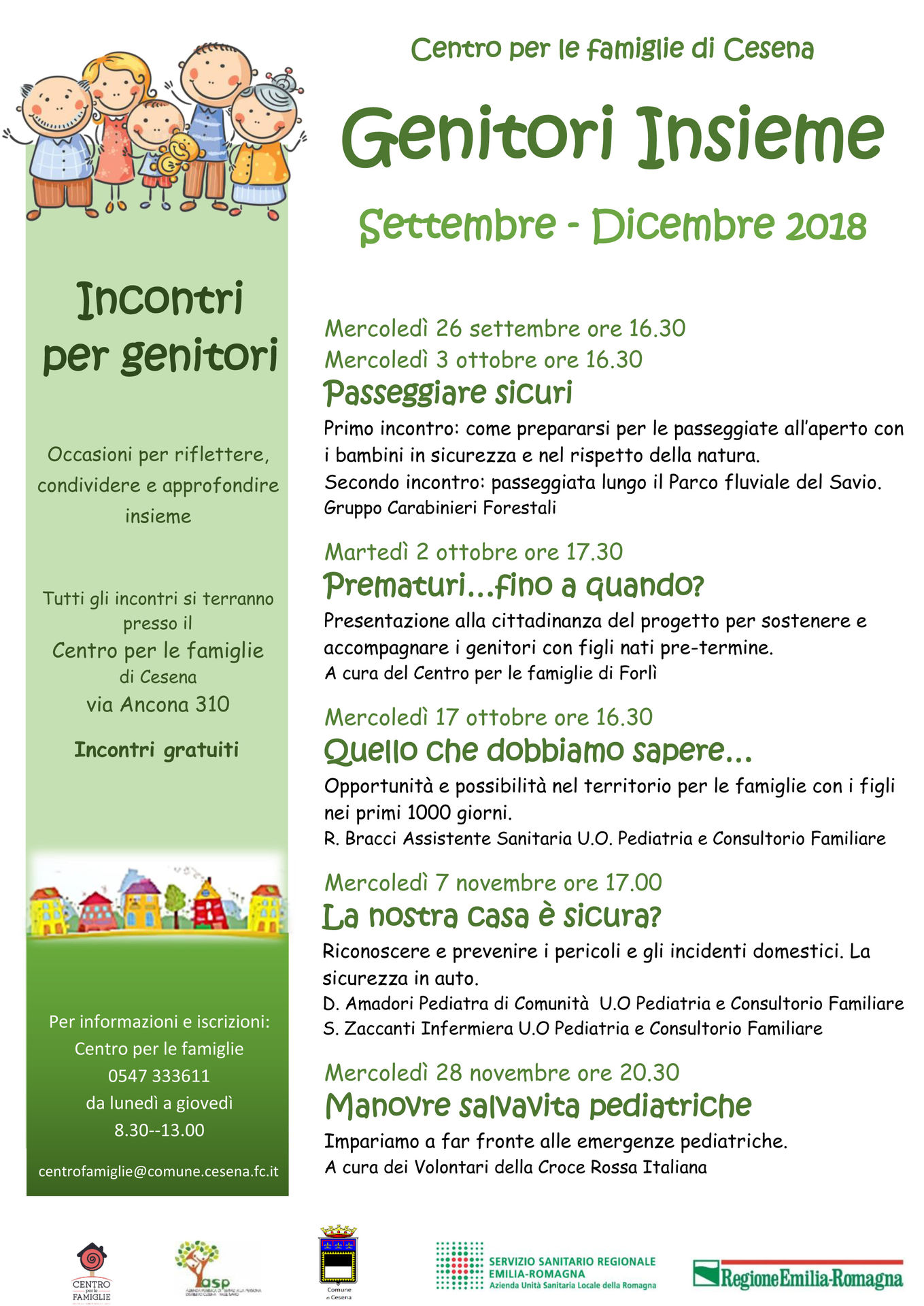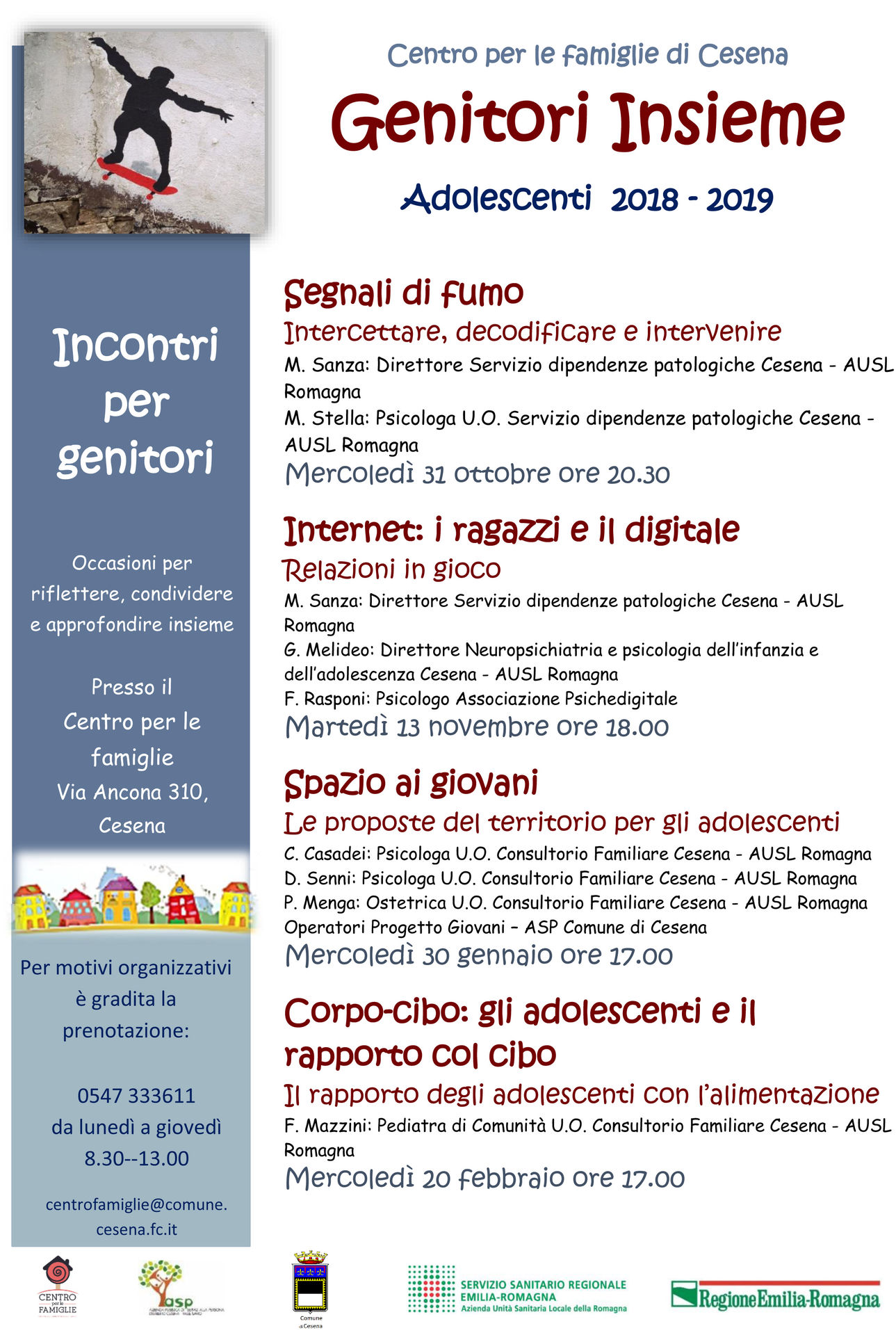 Un lungo ciclo di incontri, tutti gratuiti, da fine settembre a maggio 2019. È “Genitori insieme”, un percorso organizzato dal Centro per le Famiglie dell’Asp (Azienda servizi alla persona) Cesena-Valle Savio con l’intervento di vari professionisti su argomenti sensibili che, nel corso della crescita dei figli, un genitore può trovarsi ad affrontare.