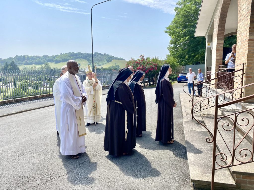 Saluto la madre abbadessa, madre Chiara Luce e la Comunità delle Monache Clarisse Cappuccine “Monastero del Corpus Domini”: siete la forza che aiuta la nostra Chiesa e quella intera, come Aronne e Cur, a tenere le braccia alzate verso Dio per tenderle verso il mondo. Siamo grati a Dio per la vostra preziosa presenza nella Chiesa di Cesena-Sarsina, un dono di Dio.