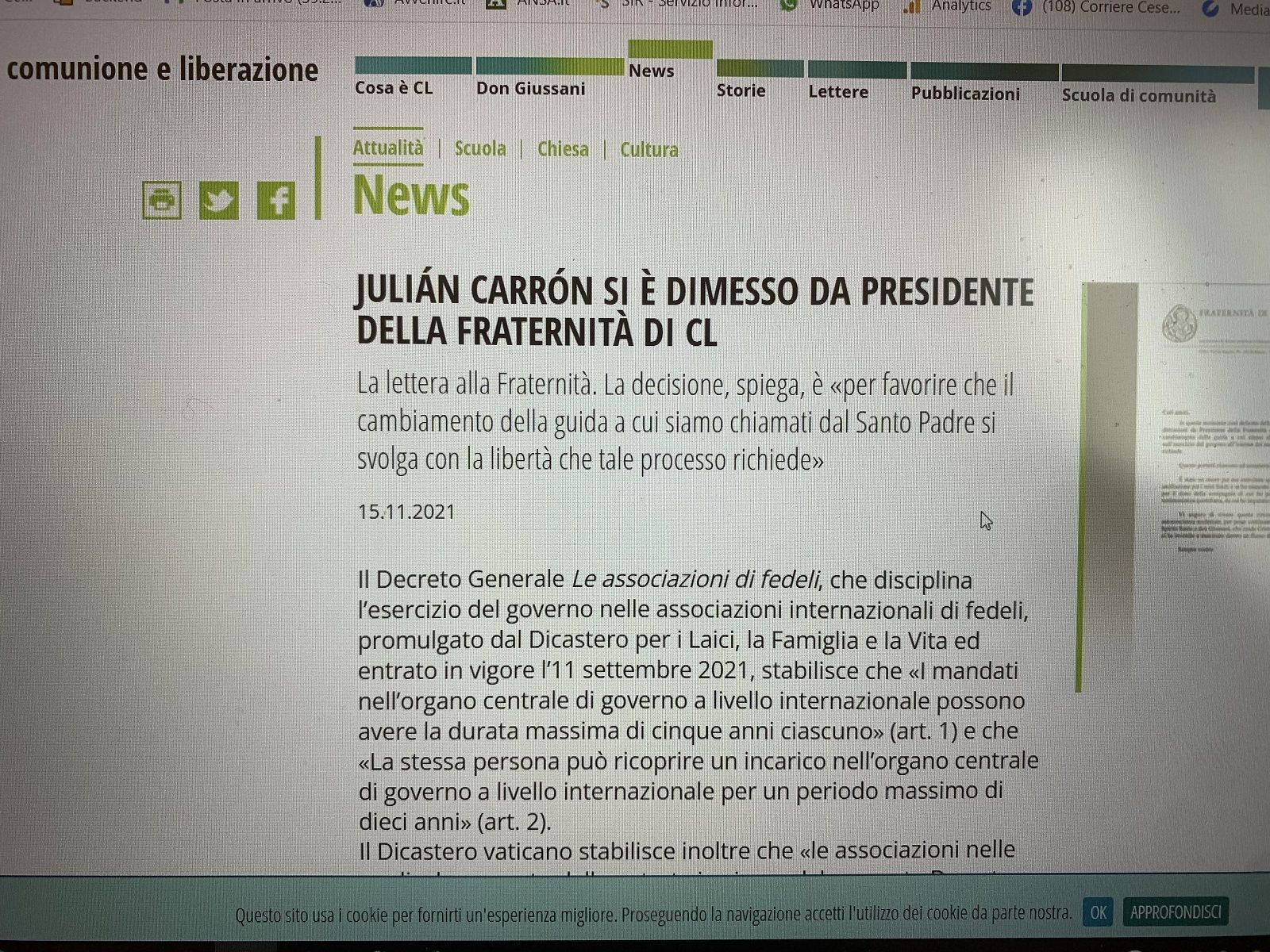 Il Decreto Generale Le associazioni di fedeli, che disciplina l’esercizio del governo nelle associazioni internazionali di fedeli, promulgato dal Dicastero per i Laici, la Famiglia e la Vita ed entrato in vigore l’11 settembre 2021, stabilisce che «I mandati nell’organo centrale di governo a livello internazionale possono avere la durata massima di cinque anni ciascuno» (art. 1) e che «La stessa persona può ricoprire un incarico nell’organo centrale di governo a livello internazionale per un periodo massimo di dieci anni» (art. 2).Il Dicastero vaticano stabilisce inoltre che «le associazioni nelle quali, al momento della entrata in vigore del presente Decreto, sono conferiti incarichi nell’organo centrale di governo a livello internazionale a membri che hanno superato i limiti di cui agli articoli 1 e 2, debbono provvedere a nuove elezioni entro e non oltre ventiquattro mesi dalla entrata in vigore del presente Decreto» (art. 4), cioè entro e non oltre l’11 settembre 2023.Essendo presidente della Fraternità di Comunione e Liberazione da oltre dieci anni, don Julián Carrón ha deciso di dimettersi da tale carica, per favorire da subito il processo di cambiamento richiesto alle associazioni internazionali di fedeli riconosciute dalla Santa Sede.Ecco la lettera con cui oggi don Carrón sta comunicando la decisione a tutti i membri della Fraternità di CL:Milano, 15 novembre 2021Cari amici,in questo momento così delicato della vita del movimento, ho deciso di presentare le mie dimissioni da Presidente della Fraternità di Comunione e Liberazione, per favorire che il cambiamento della guida a cui siamo chiamati dal Santo Padre ˗ attraverso il Decreto sull’esercizio del governo all’interno dei movimenti ˗ si svolga con la libertà che tale processo richiede.Questo porterà ciascuno ad assumersi in prima persona la responsabilità del carisma.È stato un onore per me esercitare questo servizio per anni, un onore che mi riempie di umiliazione per i miei limiti e se ho mancato nei confronti di qualcuno di voi. Rendo grazie a Dio per il dono della compagnia di cui ho potuto godere, davanti allo spettacolo della vostra testimonianza quotidiana, da cui ho imparato costantemente e da cui voglio continuare a imparare.Vi auguro di vivere questa circostanza come occasione di crescita della vostra autocoscienza ecclesiale, per poter continuare a testimoniare la grazia del carisma donato dallo Spirito Santo a don Giussani, che rende Cristo una presenza reale, persuasiva e determinante, che ci ha investito e trascinato dentro un flusso di vita nuova, per noi e per il mondo intero.Sempre vostroJulián Carrón