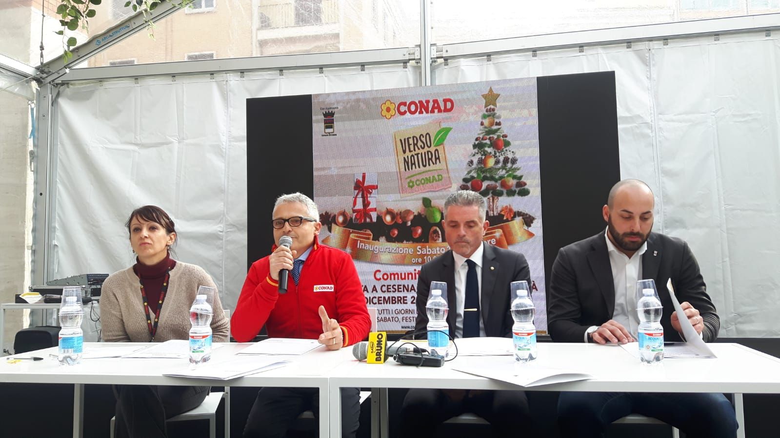 Chi in queste settimane si è anche solo ‘affacciato’ sulla rinnovata piazza della Libertà, non ha potuto fare a meno di notare il grande lavorio che in pochi giorni l’ha vista prima allestita con la pista di pattinaggio su ghiaccio, e poi della tensostruttura. È stata presentata questa mattina, in un’affollata conferenza stampa insieme a tanti ‘giubbetti rossi’ di dipendenti Conad, “Comunità in festa”: un villaggio natalizio in tensostruttura, realizzata dallo studio di architetti “Laprimastanza” di Montiano: il primo, di circa 500 metri quadi, è occupato da un mini-store dedicato alla linea “Verso Natura” Conad di cibi biologici, equo-solidali, vegani ed ecologici, da un caffè bistrot e da uno spazio eventi. Il secondo, di 160 metri quadri per circa 100 posti a sedere, è interamente dedicato ad attività e incontri. È un calendario fitto di appuntamenti quello programmato da numerose associazioni del territorio che si sono coinvolte nella gestione e promozione di eventi. Tra questi, l’Avis comunale, il Centro sportivo italiano, Tigers, Atletica Endas, Nuova Virtus, Volley Club, Arci, Assiprov, società editrice Il Ponte Vecchio, Amici di Casa Insieme.
