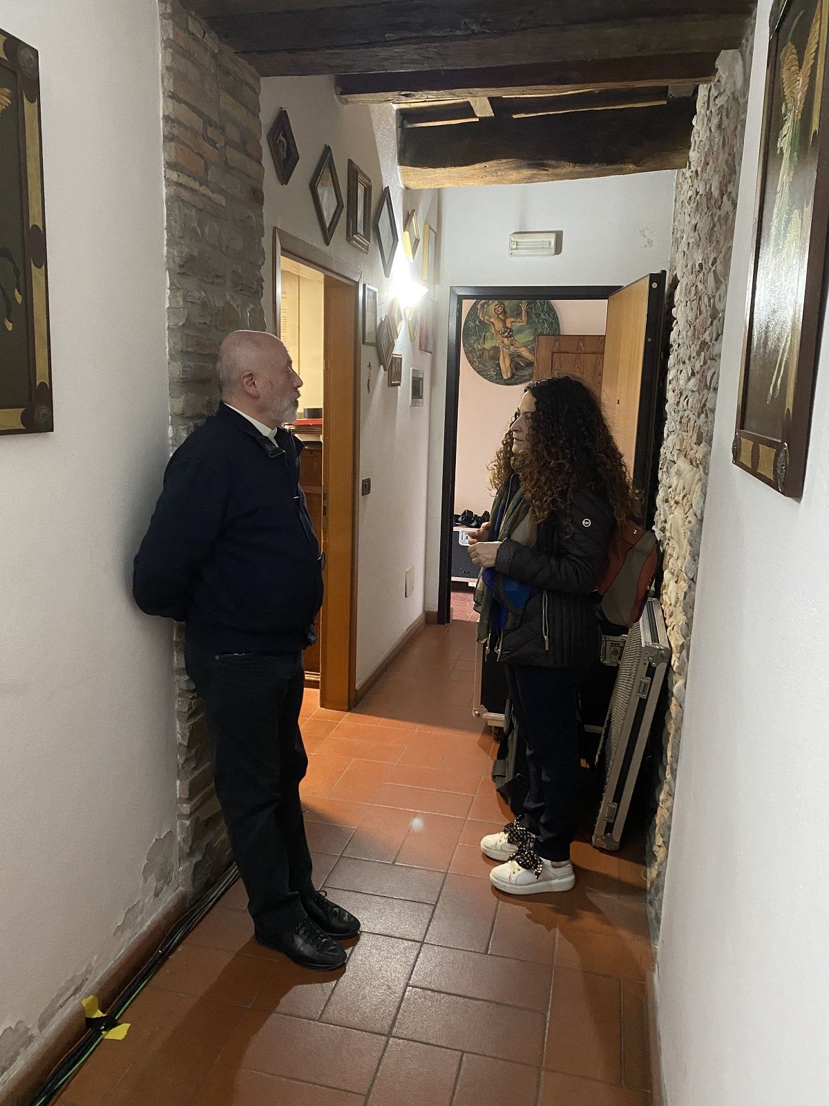 Nella foto di oggi, qui sopra: il parroco don Rudy Toneli mentre parla con la giornalista di Tv2000 Debora Ruffolo. La Ruffolo verrà a Sarsina durante ogni fine settimana, nel mese di aprile.