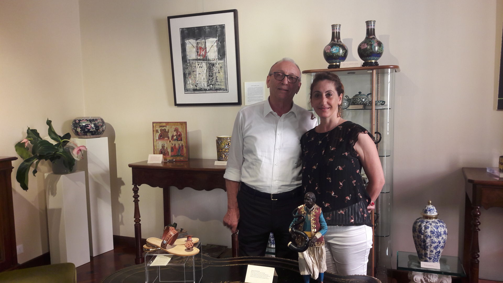 La visita in galleria è un percorso arricchente: da una pregiatissima coppia di uccellini in giada ad una favolosa coppia di porcellane di Capodimonte; dal Cristo in avorio con croce e cornice intagliata in legno dorato della seconda metà del XVIII secolo ai numerosi tappeti caucasici antichi; dalla Madonna in porcellana di manifattura Lenci alla coppia di vasi in filigrana blu di Archimede Seguso; dai cassettoni in legno d’acero in ottone e cristallo molato ai centrotavola e alle corone bizantine, dai vasi islamici del ‘600, all’icona familiare di scuola moscovita, sino ai nuovissimi sandali marchio “Le Damasco Chic” modello “Hama” il cui nome è omaggio alla martoriata città siriana, realizzati in vero coccodrillo e disegnati da Chiara Fabbri. “Ho avuto la fortuna di viaggiare molto, tanto di ciò che è esposto è frutto delle mie esperienze” sottolinea Chiara Fabbri.