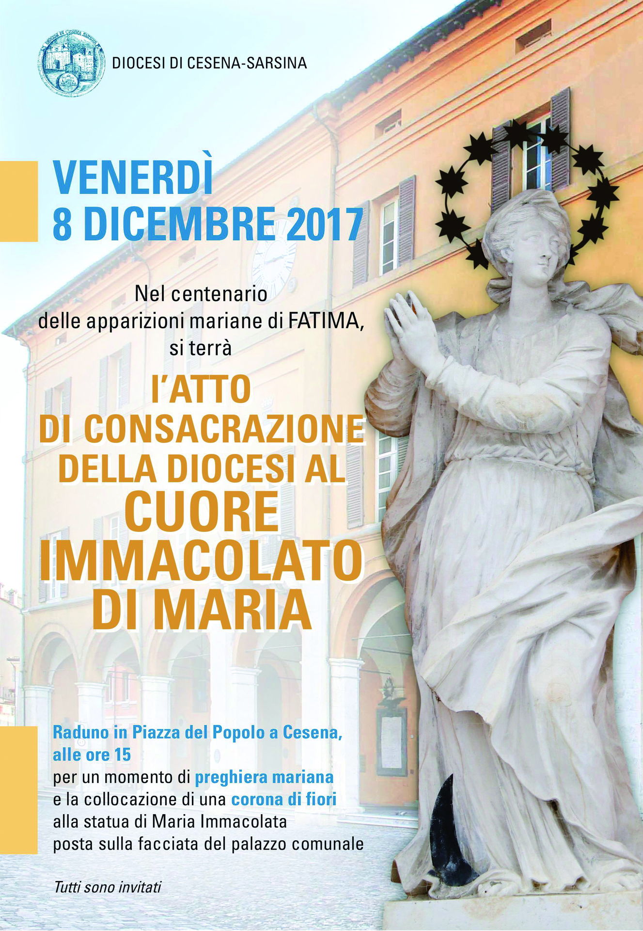 Nel centenario delle apparizioni mariane di Fatima, venerdì 8 dicembre alle 15 si terrà l’atto di consacrazione della Diocesi al Cuore Immacolato di Maria. In piazza del Popolo ci sarà un momento di preghiera mariana e poi la collocazione di una corona di fiori alla statua di Maria Immacolata posta sulla facciata del palazzo comunale. I canti saranno curati dal coro Vox Animae di San Vittore di Cesena.