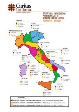 Infine, 27 diocesi (in 12 Regioni ecclesiastiche) hanno informato di aver messo a disposizione più di 32 strutture per oltre 600 posti per l’accoglienza aggiuntiva di persone senza dimora, oltre all’ospitalità residenziale ordinaria che tiene conto delle misure di sicurezza indicate dai decreti del Governo. “Questa varietà d’interventi, iniziative e strutture messe in campo dalla Chiesa che è in Italia in questa emergenza – dichiara don Francesco Soddu, direttore di Caritas Italiana – oltre a essere segno visibile di quella ‘fantasia della carità’ a cui Papa Francesco c’invita continuamente, è testimonianza tangibile di un servizio alle persone, ai più poveri in particolare e a chi è in prima linea nella cura dei malati, e quindi al Paese intero”.