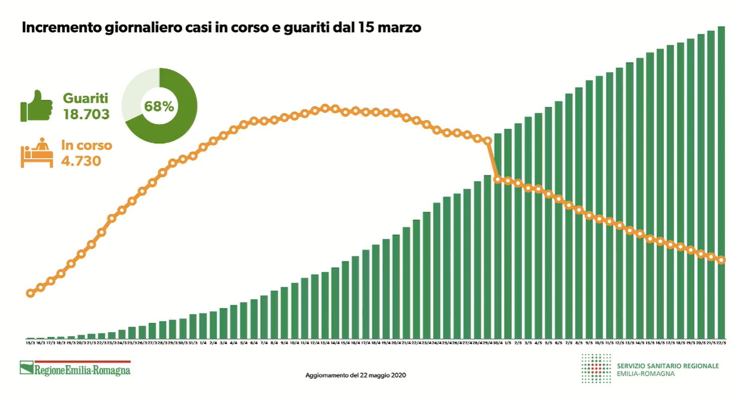 Mostrando i grafici dell’andamento dell’epidemia (sotto), l’assessore Donini ha mostrato come sia “in costante discesa la curva delle persone con la malattia” e “in salita quella dei guariti”. “A fine aprile – ha rilevato Donini – le due curve si sono incrociate e invertite. Ci auguriamo che nei prossimi giorni la forchetta si ampli ulteriormente”. I nuovi casi, ha tenuto a precisare l’assessore regionale, sono per lo più asintomatici, rintracciati attraverso esami sierologici.