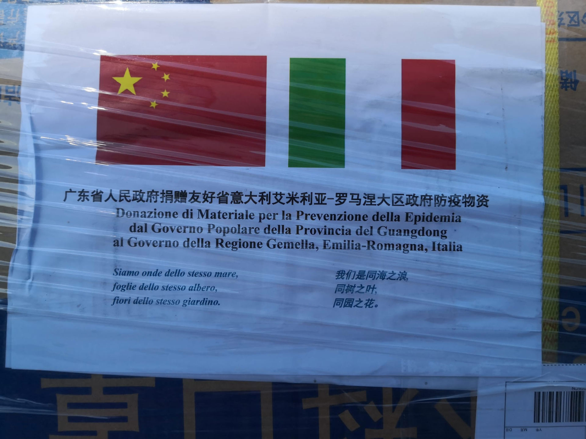 “Siamo onde dello stesso mare, foglie dello stesso albero, fiori dello stesso giardino”. Questo il messaggio che accompagna il carico di 200 mila mascherine chirurgiche arrivate questa mattina per iniziativa del governatore della Provincia cinese del Guangdong, Ma Xingrui, territorio gemellato con la Regione Emilia-Romagna dal 2015, e che saranno subito consegnate al magazzino della sanità di Reggio Emilia. E altre 20 mila mascherine arriveranno dalla città di Heyuan, sempre della Provincia di Guangdong, gemellata con Ferrara.