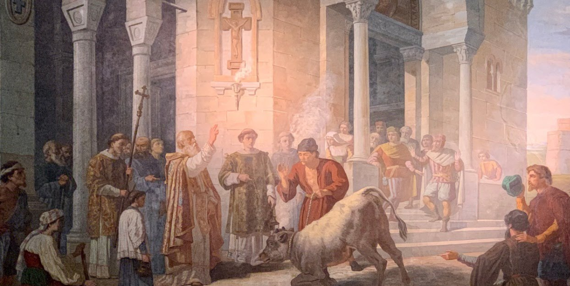 Era il 6 maggio 1493 quando i frati francescani, riuniti nel convento di Longiano per celebrare il Capitolo provinciale, ricevettero in dono dagli abitanti di Gambettola una vitella. L’animale, mentre veniva portato nel convento, si inginocchiò di fronte all’immagine del Santissimo Crocifisso, che allora si trovava sopra una porta laterale della chiesa. Nonostante le frustate, il bovino non si mosse dalla posizione di venerazione finché non fu benedetto dal padre provinciale.