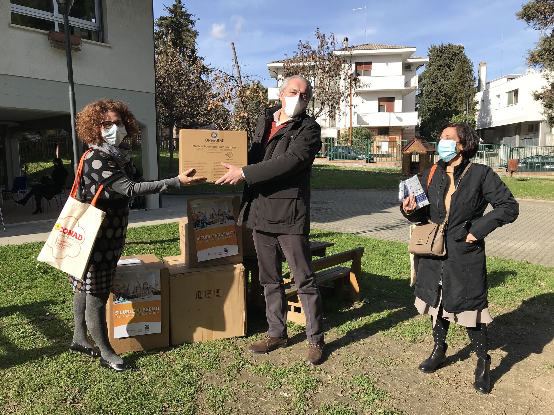 Da Cia-Conad una donazione di cinquantamila mascherine Ffp2 e chirurgiche e 120 dispenser a muro. La generosa donazione di kit di protezione individuale, consegnata oggi pomeriggio, sarà distribuita al personale dei nidi e delle scuole dell’infanzia comunali, agli educatori dei centri educativi pomeridiani ospitati nei plessi delle scuole primarie e medie e di quelli autonomi gestiti dalle associazioni.